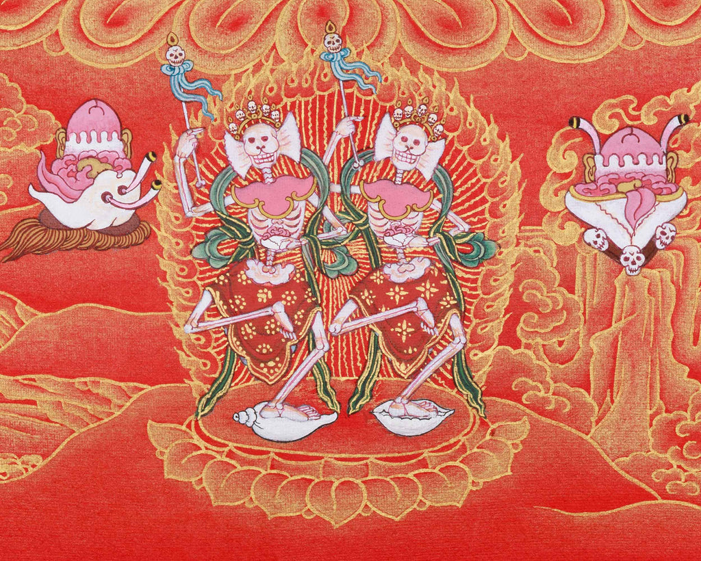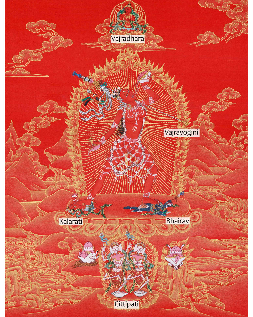 As a manifestation of supreme wisdom and compassion, the Tantric Goddess Vajrayogini is depicted in her iconic dynamic posture, symbolizing the transformation of desire into enlightenment. Her luminous physique, embodying the energy necessary for spiritual illumination, radiates both beauty and ferocity. The primordial Buddha, represented by Vajradhara at the pinnacle of the Thangka, reinforces the connection between Vajrayogini's practices and the most profound tantric teachings. At the lower section are the Cittipati Guardians, who vigilantly guard the Dharma and symbolize transience and vigilance.