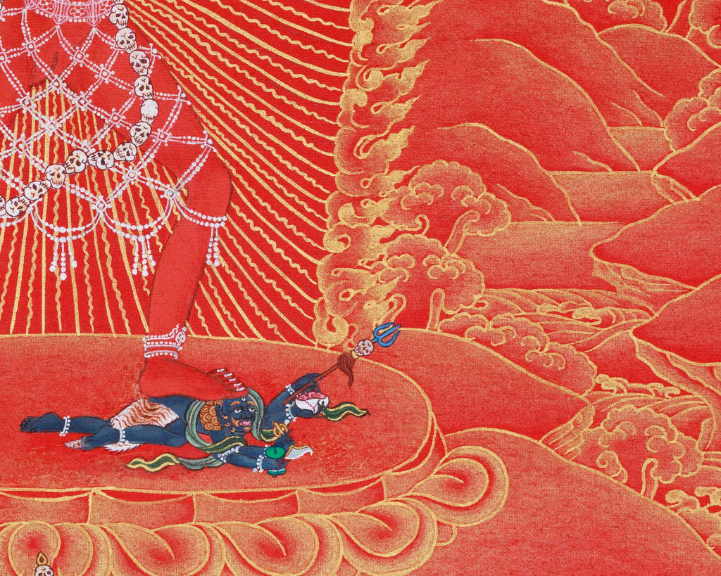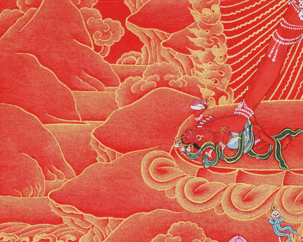 This artwork, crafted on canvas, demonstrates the meticulous dedication to detail characteristic of skilled artisans. A luminous brilliance is imparted to the delicate features through the use of genuine 24K gold, accentuating Vajrayogini's celestial form, her ornaments, and the sacred symbols surrounding her. The vivid crimson background, painted with vibrant acrylics, represents passion transformed into enlightenment and provides a striking contrast that highlights the traditional Nakthang artistry. The natural texture of the cotton canvas ensures durability and authenticity, while the harmonious integration of colors and gold results in a work of art that eloquently embodies Vajrayogini's spiritual power. Each element is illustrated in accordance with traditional meditation texts, ensuring both spiritual integrity and artistic precision.