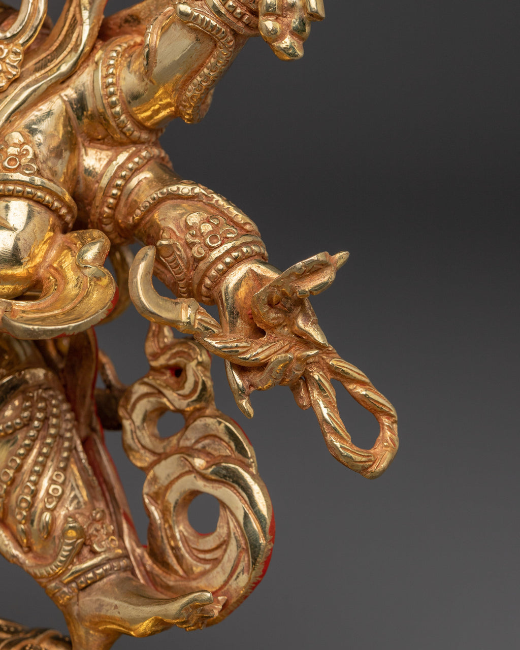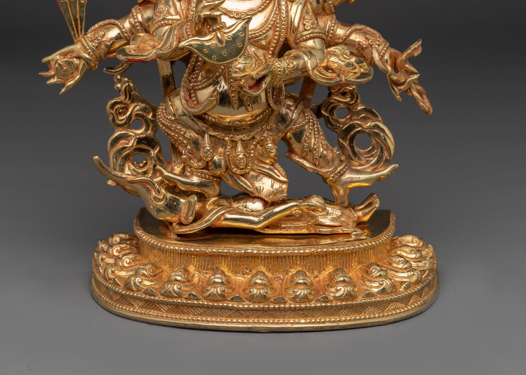 The Tantric Protector Six-Armed Mahakala Statue stands 12.4 inches (31.5 cm) tall with a base width of 9.6 inches (24.5 cm) and weighs 4.21 kg. Expertly crafted from a copper body, it is richly gilded in 24K gold and adorned with intricate gold and acrylic paintings. As one of the most revered wrathful protectors in Vajrayana Buddhism, Mahakala embodies the fierce compassion that removes obstacles and destroys inner and outer negativities. Its striking presence and masterful craftsmanship make it an ideal addition to any meditation space, altar, or collection of sacred Tibetan art.