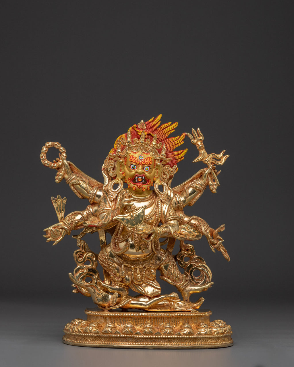 The six-armed Mahakala depicts him in a dynamic and commanding position, carrying six symbolic implements representing his capacity to destroy ignorance and negativity. His wrathful expression radiates power and determination, while his crown's intricate design, ornaments, and detailed carving demonstrate Nepalese craftsmanship. The oxidized finish enhances the statue's divine presence and is a potent reminder of his role in protecting the Dharma and guiding practitioners to spiritual liberation.