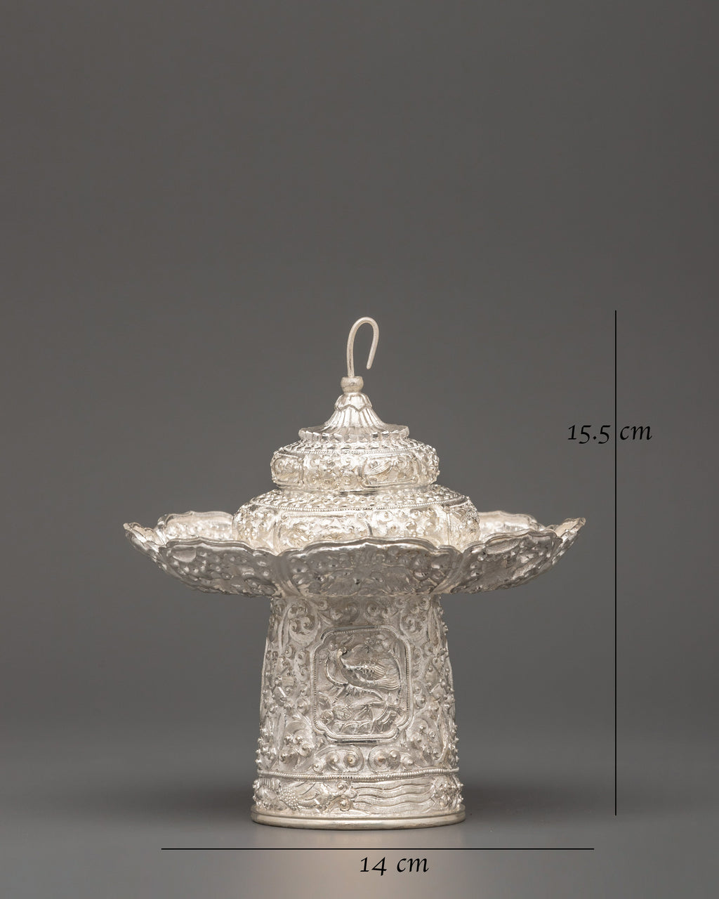 This exquisite teapot is a gorgeous piece of Buddhist-inspired home decor, handmade from pure silver. Its height is 15.5 cm and its breadth is 14 cm, making it an outstanding emblem of peace and harmony. The exquisite design, complete with detailed carvings, brings a sense of spiritual beauty to any living area. Weighing only 0.40kg, this lightweight object combines usefulness and art in its presentation.