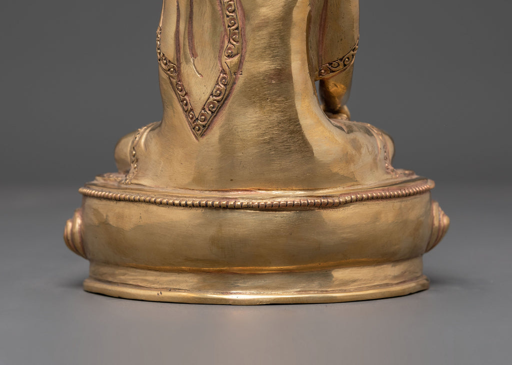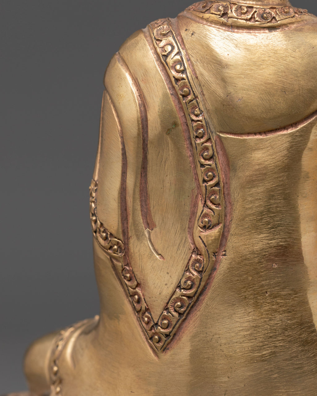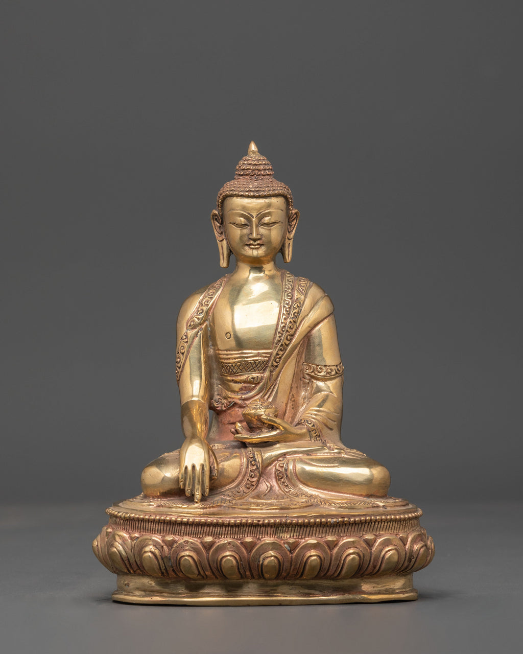 Standing 22 cm tall and 16 cm broad, this exquisite handcrafted statue of Siddhartha Gautama known as Shakyamuni Buddha , has a balanced and serene form that perfectly captures the Buddha's serene presence. The statue is made from a copper body and exhibits traditional artisanal talent with its warm and rich texture . From the delicate face expression to the flowing robes, the handcrafted details demonstrate the commitment and craftsmanship that went into making this holy work. It feels substantial due to its size and weight (1.42 kg), which makes it a significant addition to any shrine or meditation area.