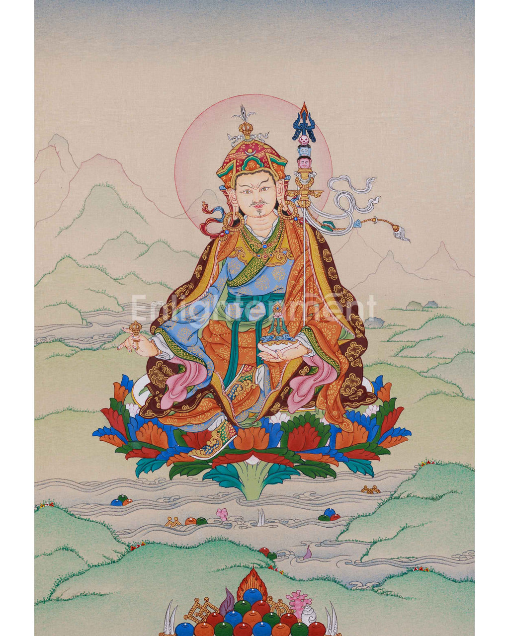 Enter the revered presence of the Teacher of the Dharma, Guru Rinpoche, through a divine thangka that exquisitely depicts his wisdom, power, and spiritual guidance. Created by hand in our Enlightenment Studio, this thangka is carefully produced on high-quality cotton canvas utilizing natural stone pigments and genuine 24K gold. The artwork is a spiritual masterpiece that elevates and inspires your environment with its divine energy. It features a distinctive background that emphasizes Guru Rinpoche's sacred presence, with gentle hills enveloping him in a serene, protective setting.