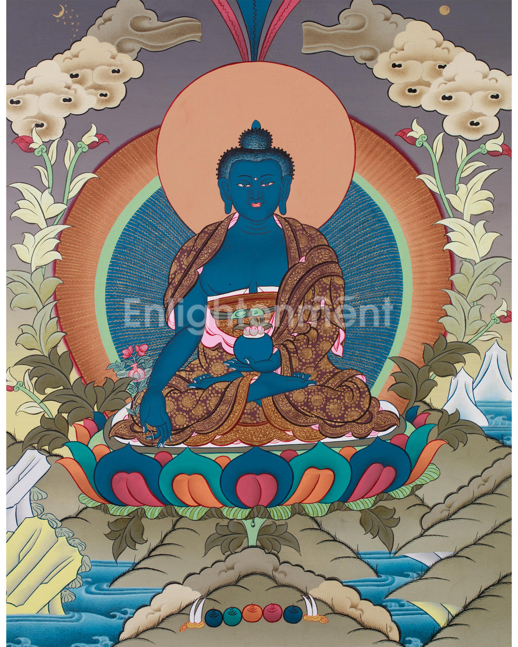 This thangka shows Bhaisajyaguru seated on a lotus throne with a deep blue body radiating healing light. His right hand holds a myrobalan (a medicinal plant), and his left hand holds a bowl of healing nectar, symbolizing purification. Golden accents highlight his serene yet powerful presence, transforming negative energy into healing. Sacred elements, such as lotus flowers and medicinal herbs, surround him, underscoring his role as a healer. Invite this Blue Buddha Thangka into your space to fill it with his divine healing energy of peace, protection, and well-being.
