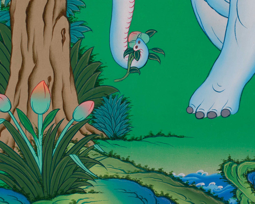 This Thangka of Four Harmonious Friends is carefully hand-painted on high-quality cotton canvas, demonstrating exceptional workmanship. The artist uses bright acrylics to create a vivid, detailed narrative and adds 24K gold accents to emphasize key features, giving the piece a sacred and luxurious feel. The traditional Nepali painting style is used, ensuring the artwork stays true to its cultural roots and depth. The premium materials enhance the thangka’s durability and preserve its colors, making it a beautiful visual and spiritual addition to any space.