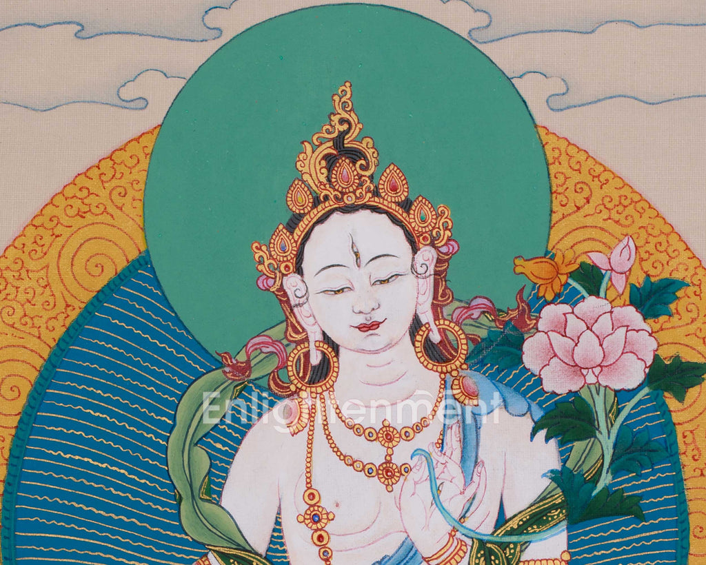 White Tara, the Goddess of Longevity and Compassion in Tibetan Buddhism, is invoked for protection, healing, and long life. Her name relates to her white color, symbolizing purity and wisdom. Born from Avalokiteshvara's tears, she gently comforts those in need. She embodies compassionate action and a long life, free from obstacles and illness. In this thangka, White Tara is meditating on a lotus throne, holding a lotus flower and offering blessings. Her vibrant robes, gold accents, and peaceful background highlight her divine beauty and nurturing qualities, emphasizing longevity, protection, and spiritual healing.