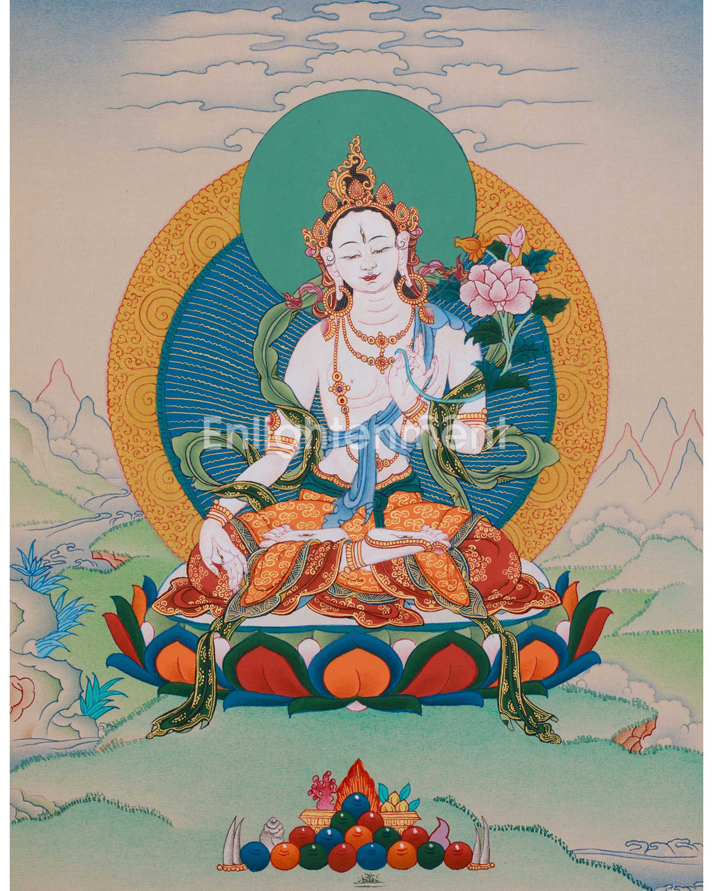 Traditional Thangka of Long Life Goddess White Tara | Sita Tara, Known for Her Seven Eyes of Compassion