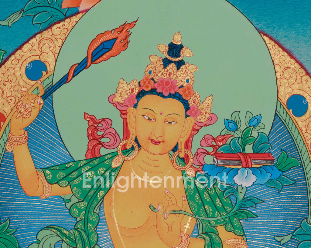 A Thangka of Manjushri, also known as Manjughosha, is a revered Bodhisattva in Mahayana and Vajrayana Buddhism. He is depicted as a youthful figure wielding a sword in one hand, symbolizing the ability to cut through ignorance and delusion, and holding a book in the other, representing wisdom and knowledge. Manjushri embodies the principle of wisdom and is regarded as the Bodhisattva of transcendent wisdom.