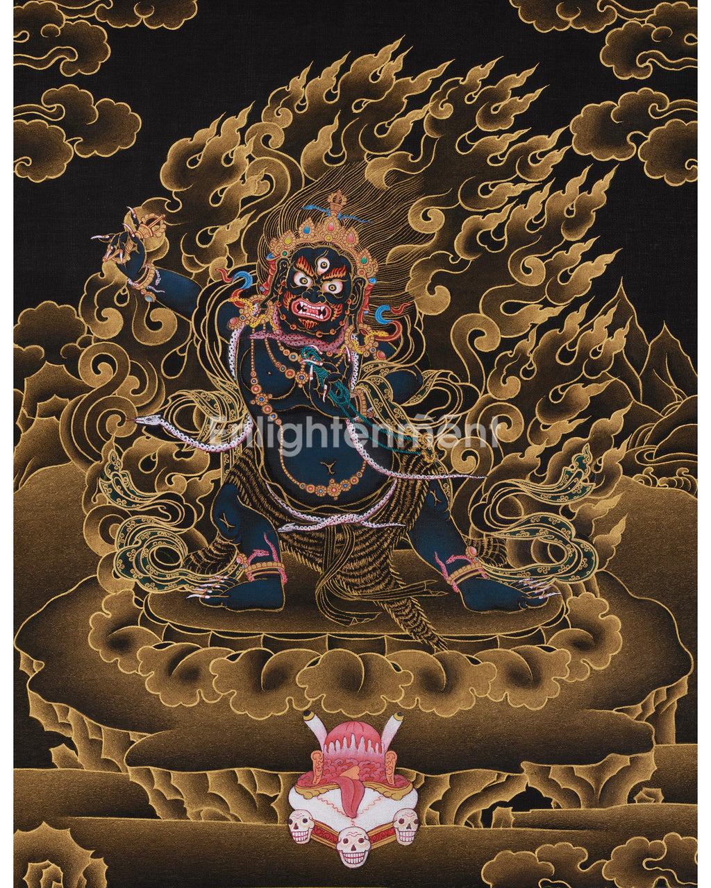 Immerse yourself in the divine strength of the Thangka of Vajrapani, hand-painted with vibrant acrylic colors and enhanced with genuine 24K gold in the Nakthang (Gold on Black) style. The gold detailing intricately emphasizes Vajrapani’s form, highlighting his fierce energy and divine protection. Painted on cotton canvas, this artwork is meticulously created, capturing Vajrapani’s powerful presence. His form, complete with dynamic force and intensity, symbolizes his role as a protector and guide in Tibetan Buddhism.
