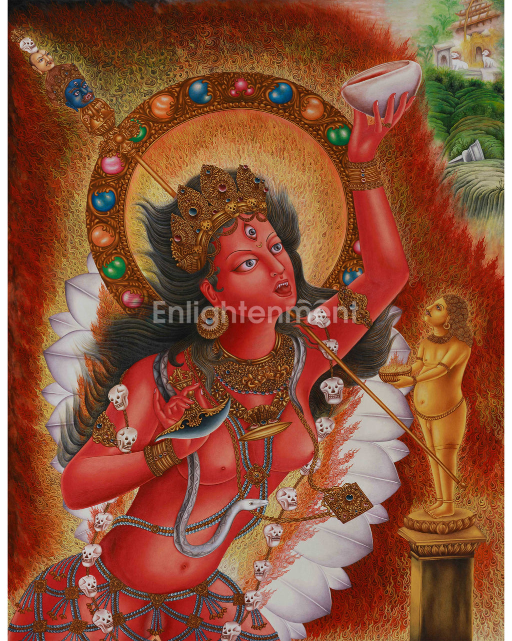 With her five jeweled crowns, a snake, skull malas, and gold-studded jewelry, the spiritual goddess represents the transmutation of death and the changing nature of the physical body. These ornaments transcend dualistic thinking, integrate insight and method in spiritual practice, and eliminate attachment to the ego. The halo behind her is adorned with colorful gemstones that could represent the divine qualities or cosmic energies under her control. The flames surrounding her further highlight her fierceness and the cleansing quality of her energy, consuming illusion and negativity to bring about spiritual clarity. She is often depicted holding a bowl and a ritual, curved knife, symbolizing her ability to sever the ego and attachment ties that bind people to pain. Her trident represents power and the triple nature of creation, preservation, and destruction.