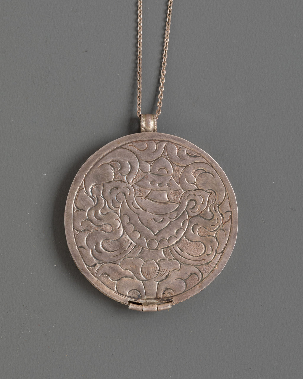 A Buddhist locket is a piece of jewelry designed to hold a small prayer, mantra, or image related to Buddhist practice. The locket may feature a design or image of a Buddhist deity, such as the Buddha, or a representation of a sacred symbol, like the lotus flower. It is typically worn as a talisman to remind the wearer of their spiritual path and to offer protection. Some Buddhist lockets are also used as a form of religious devotion and are frequently given as gifts to friends and family members to provide them with spiritual support and blessings.