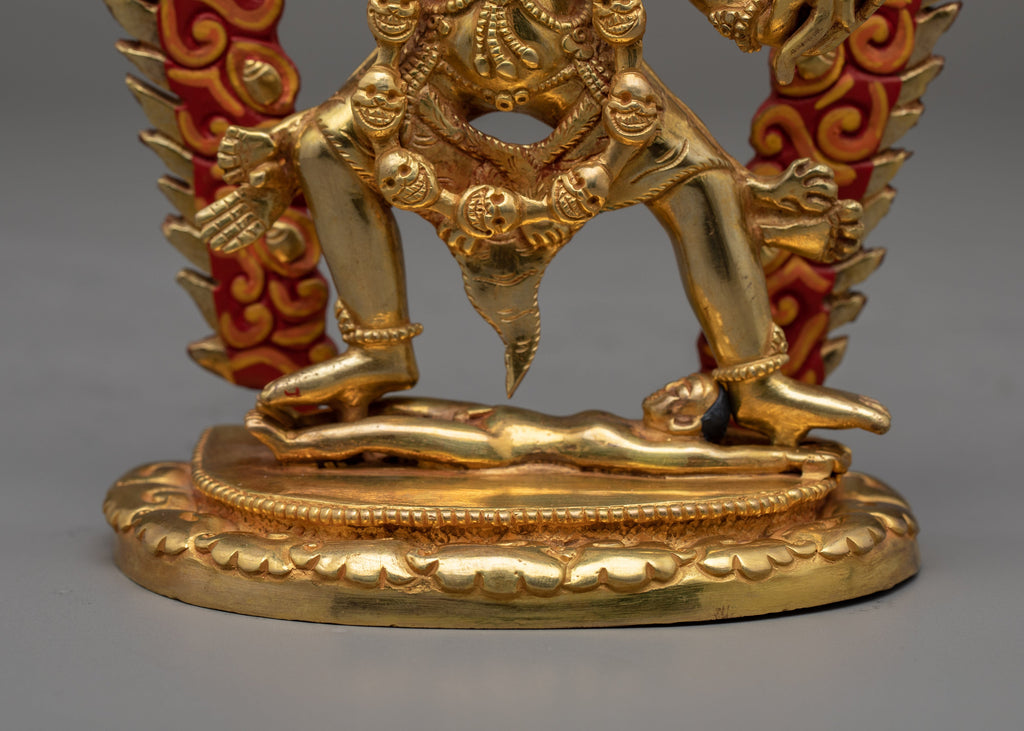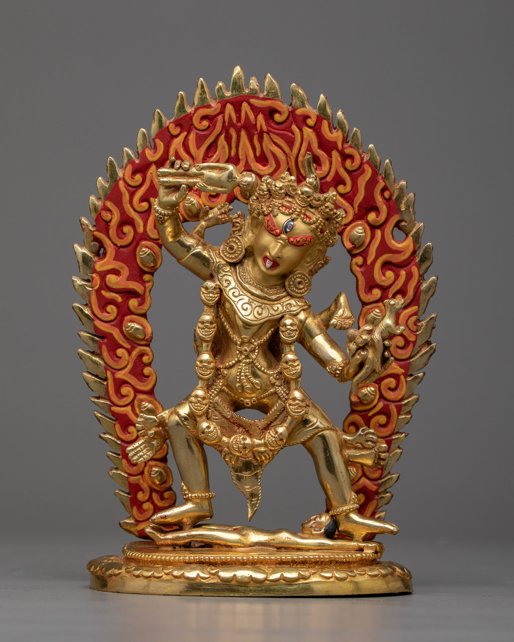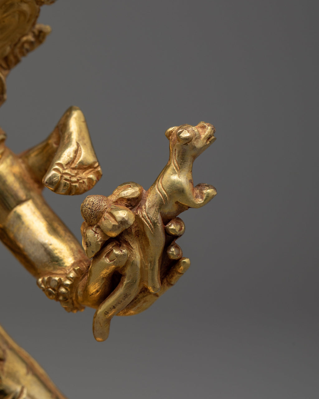 The statue, adorned with careful details, stands gently at a magnificent height that creates a powerful presence in your sacred place. Expert artisans have used copper's tenacity to create a robust body that acts as a canvas for exquisite decorations and a reflection of the statue's heavenly essence. The 24-karat gold gilded accents and acrylic paintings breathe life into the figure, emanating a golden hue that radiates tranquility and grace