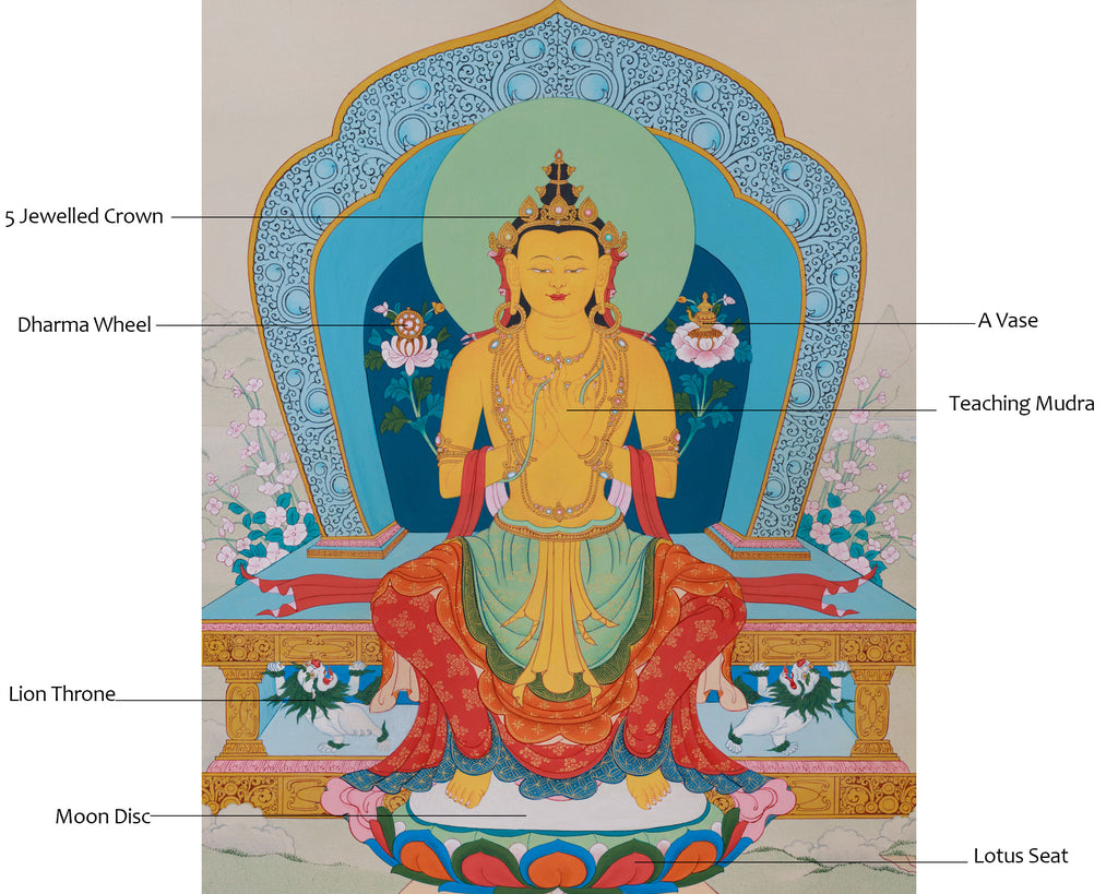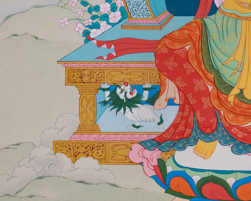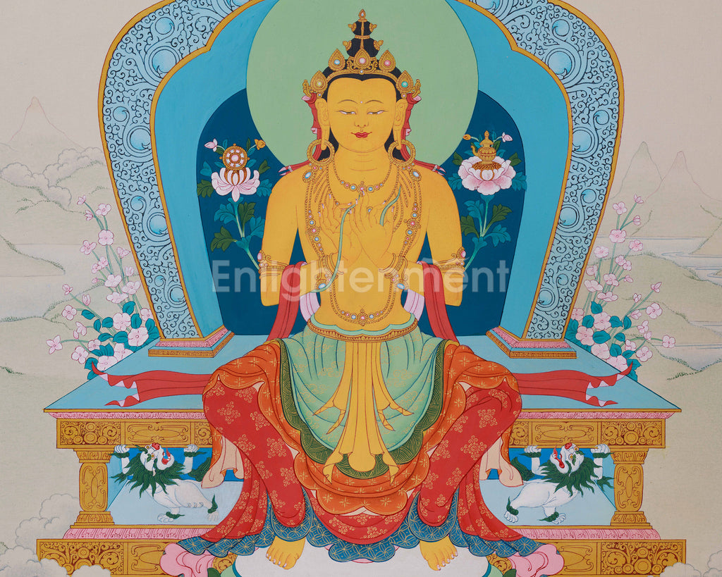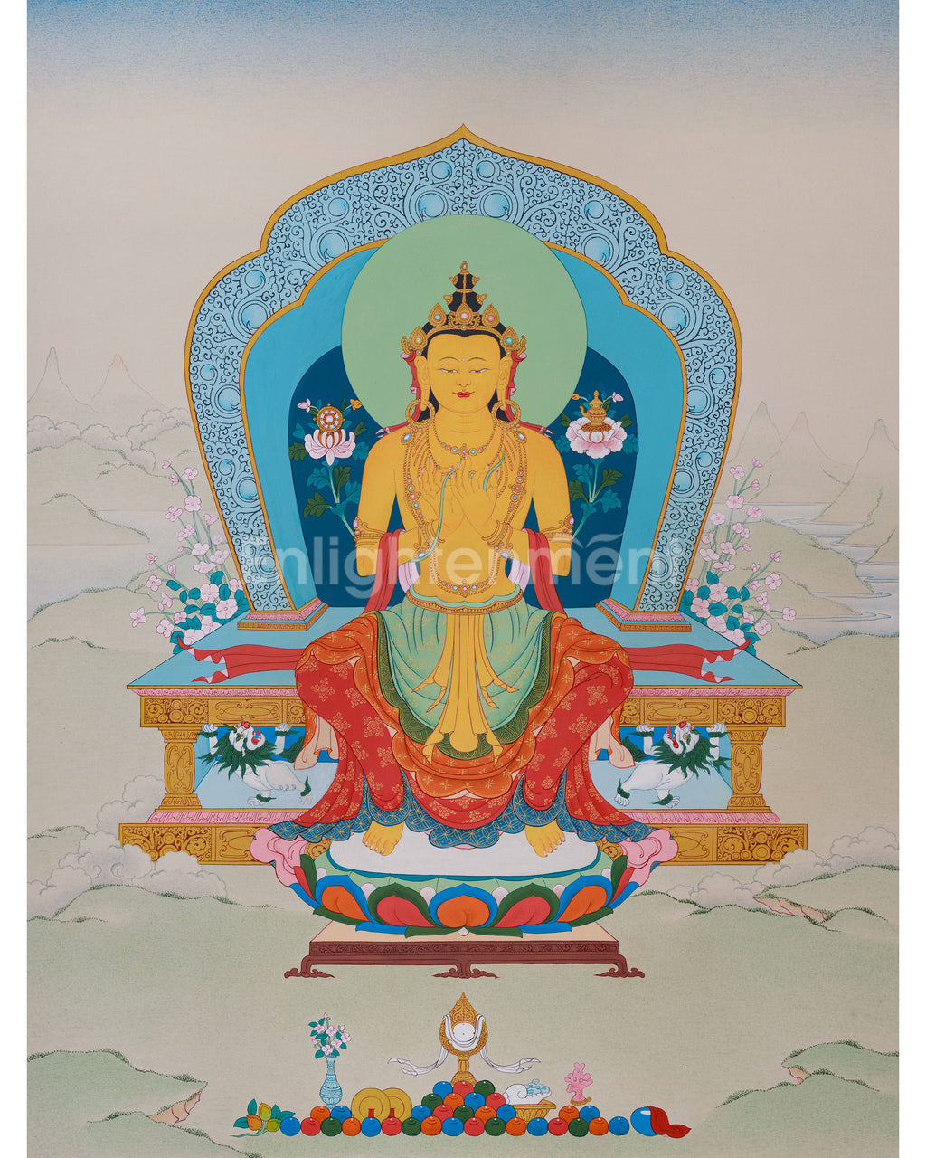 Placing this painting in your meditation room, altar, or living space can foster peace, inspiration, and spiritual aspiration. The vivid colors and shining gold accents not only uplift the spiritual environment but also remind viewers of Maitreya's future coming and his guidance for a brighter future.