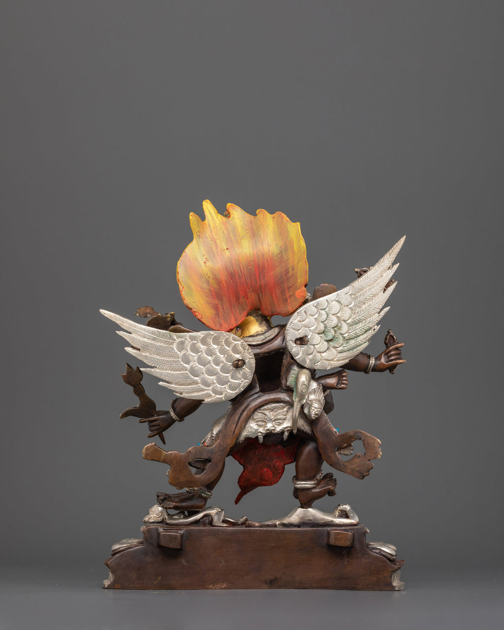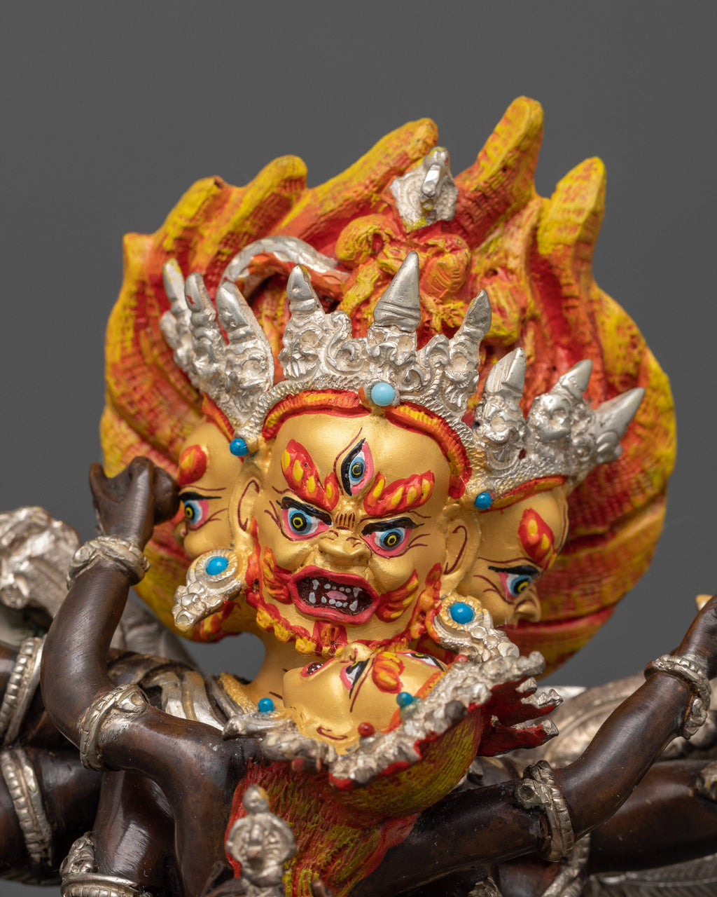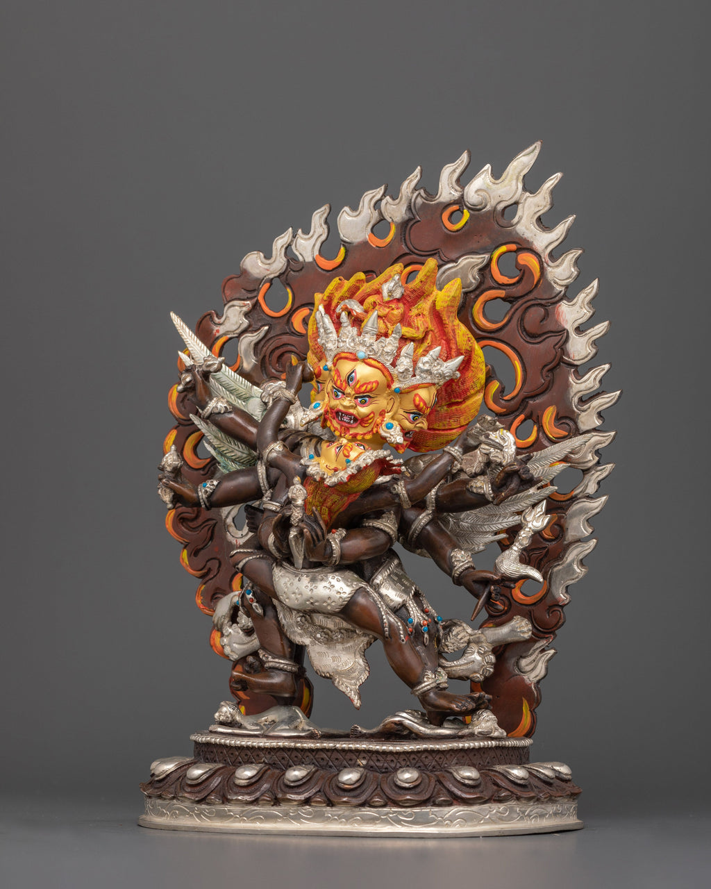 Vajrakilaya is depicted in a dynamic and powerful posture in union his consort, with his multiple arms holding various symbolic implements, including the phurba (ritual dagger), which is used to subdue demons and cut through obstacles. His wrathful expression and intense gaze signify his unwavering resolve to protect the Dharma and annihilate all negative forces. Despite his fierce appearance, Vajrakilaya’s form is one of compassionate action, aimed at liberating beings from suffering and guiding them toward enlightenment.