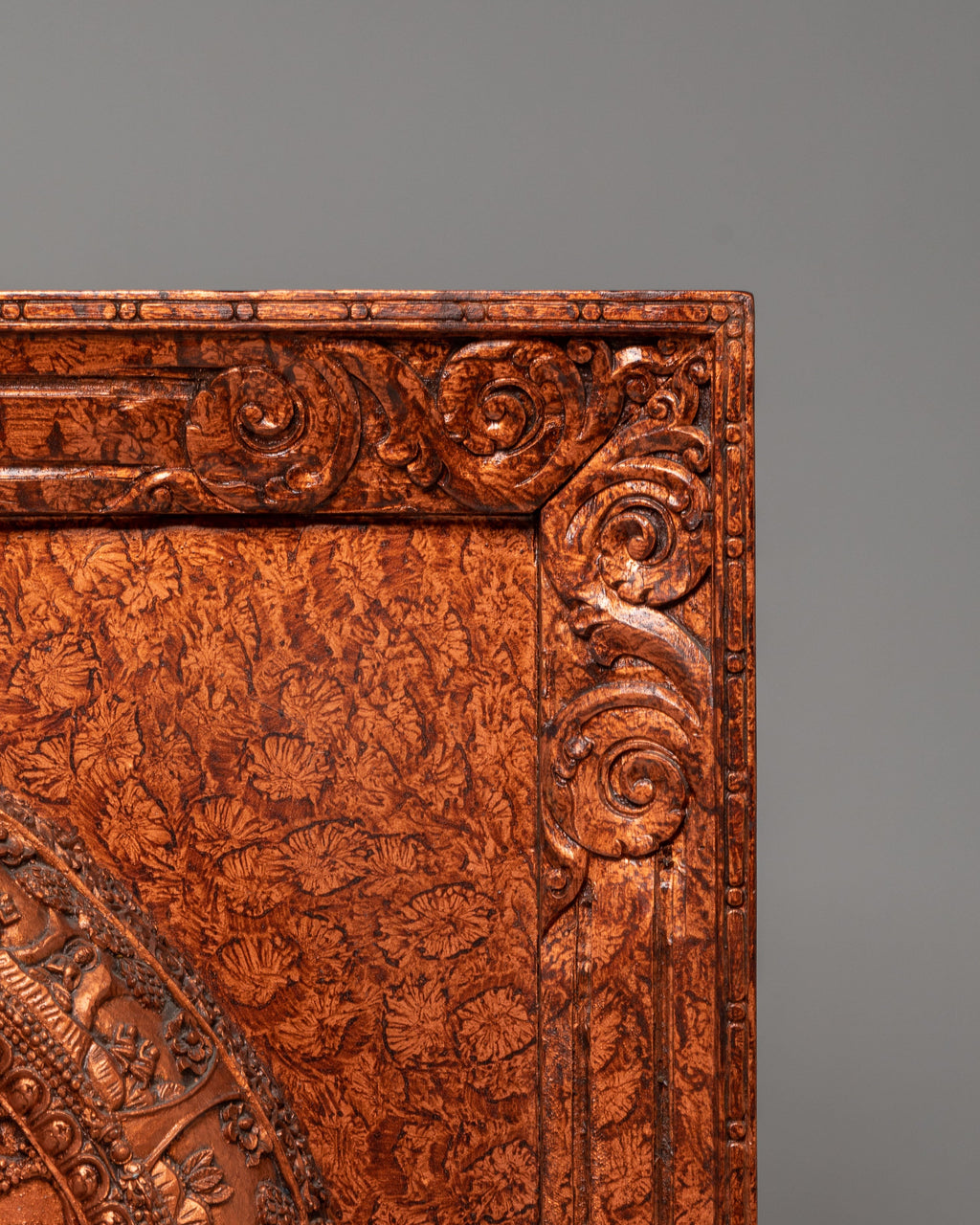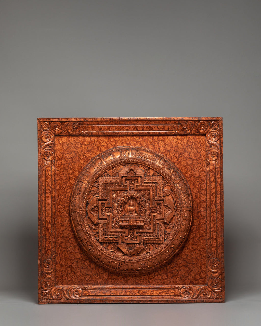 The design of this wall hanging features Shakyamuni Buddha at the center, surrounded by detailed Buddhist symbols and spiritual motifs. His posture represents meditation and inner peace, while the intricate carvings around him include symbols of purity, growth, and divine protection. The stone dust epoxy binding adds texture and depth to the piece, ensuring the fine details of the Buddha’s robes and the surrounding motifs are clearly visible. The use of gold accents highlights the Buddha’s divine presence, while the wooden back provides a solid foundation, making it suitable for both hanging and display.