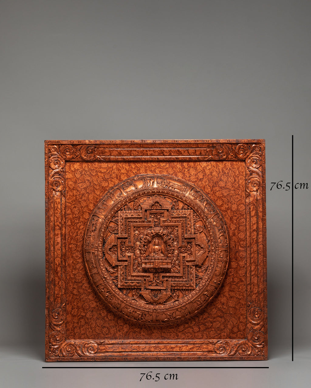 This, the First Buddha Shakyamuni Wall Hanging, is a spectacular, intricately detailed representation of Shakyamuni Buddha, the founder of Buddhism and the embodiment of enlightenment. Standing 76.5 cm high and 76.5 cm wide, this powerful wall hanging is crafted with stone-dust epoxy binding and a wooden back. Shakyamuni Buddha, seated in the classic lotus position, symbolizes peace, wisdom, and the path to enlightenment. The design captures the profound serenity of the Buddha, inviting a sense of calm, reflection, and spiritual growth into any room.