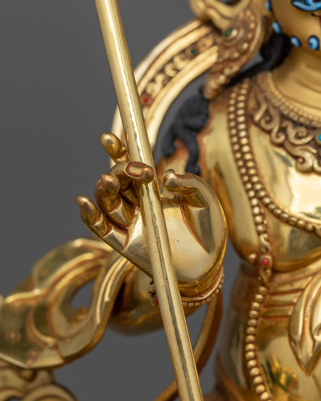 The Guardian of Sacred Space Namtoshe statue stands 19.9 inches (50.5 cm) in height with a base width of 15.4 inches (39 cm). The statue is handcrafted in Nepal, with the copper body delicately embellished with triple layers of 24K gold gilding, deeply engraved carving, and intricate acrylic & gold paintings.