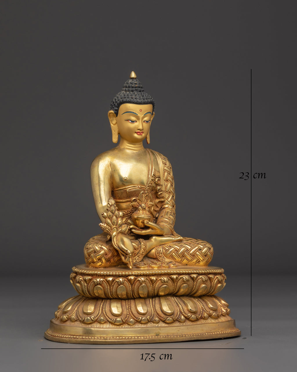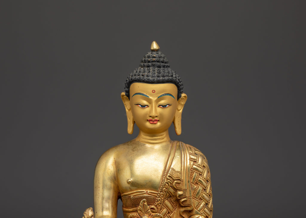 The Medicine Buddha Statue is a remarkable piece crafted to inspire healing, tranquility, and spiritual well-being. Measuring 23cm tall and 17.5cm wide, it is perfectly sized to grace your altar, meditation corner, or any sacred space within your home. Made from copper, this statue is elegantly gilded with gold and enhanced by intricate acrylic paintings that highlight the Buddha’s serene expression and intricate details. As a symbol of healing energy and compassion, the Medicine Buddha brings a powerful spiritual presence to your practice or decor. The gold-gilded finish not only adds a touch of luxury but also evokes a sense of calm and reverence. The copper base symbolizes the vital connection between earth and spirit, grounding the statue’s healing energy in your environment.