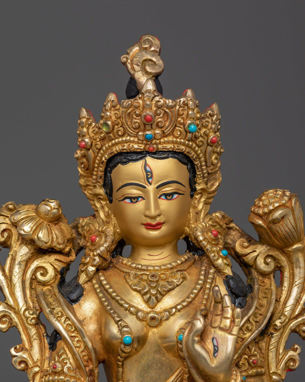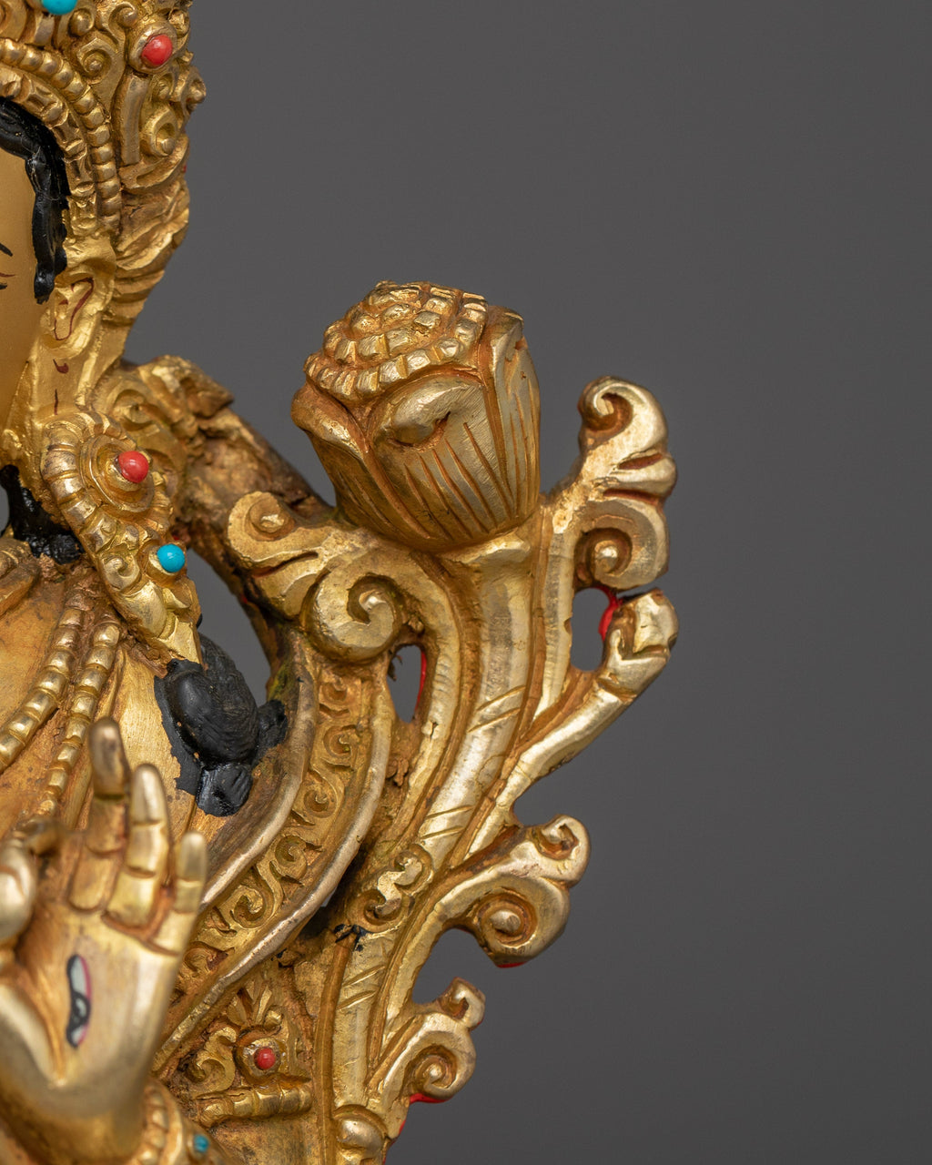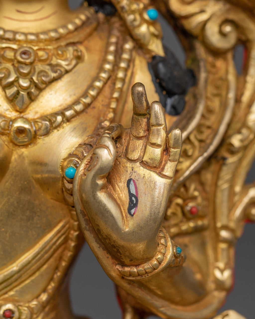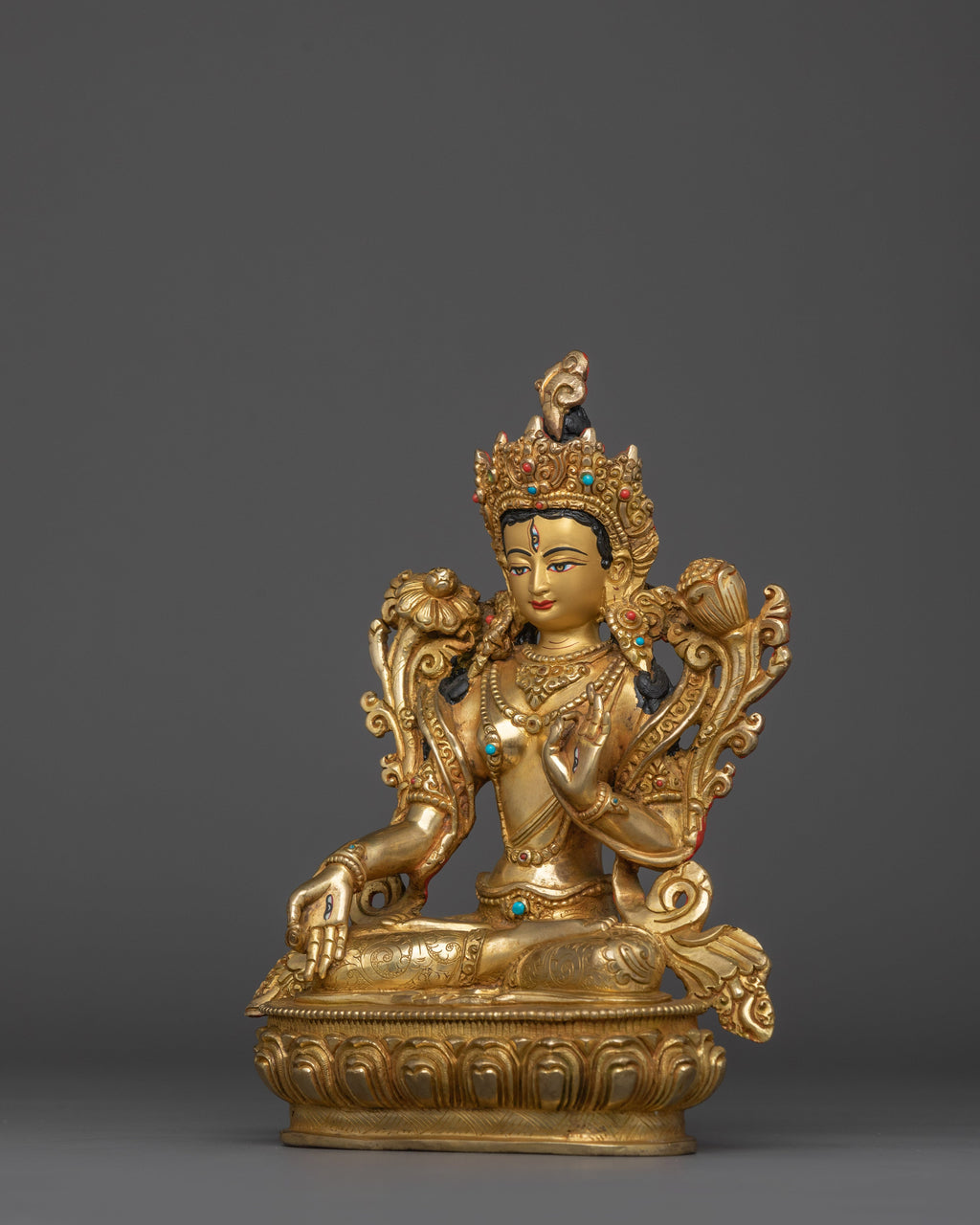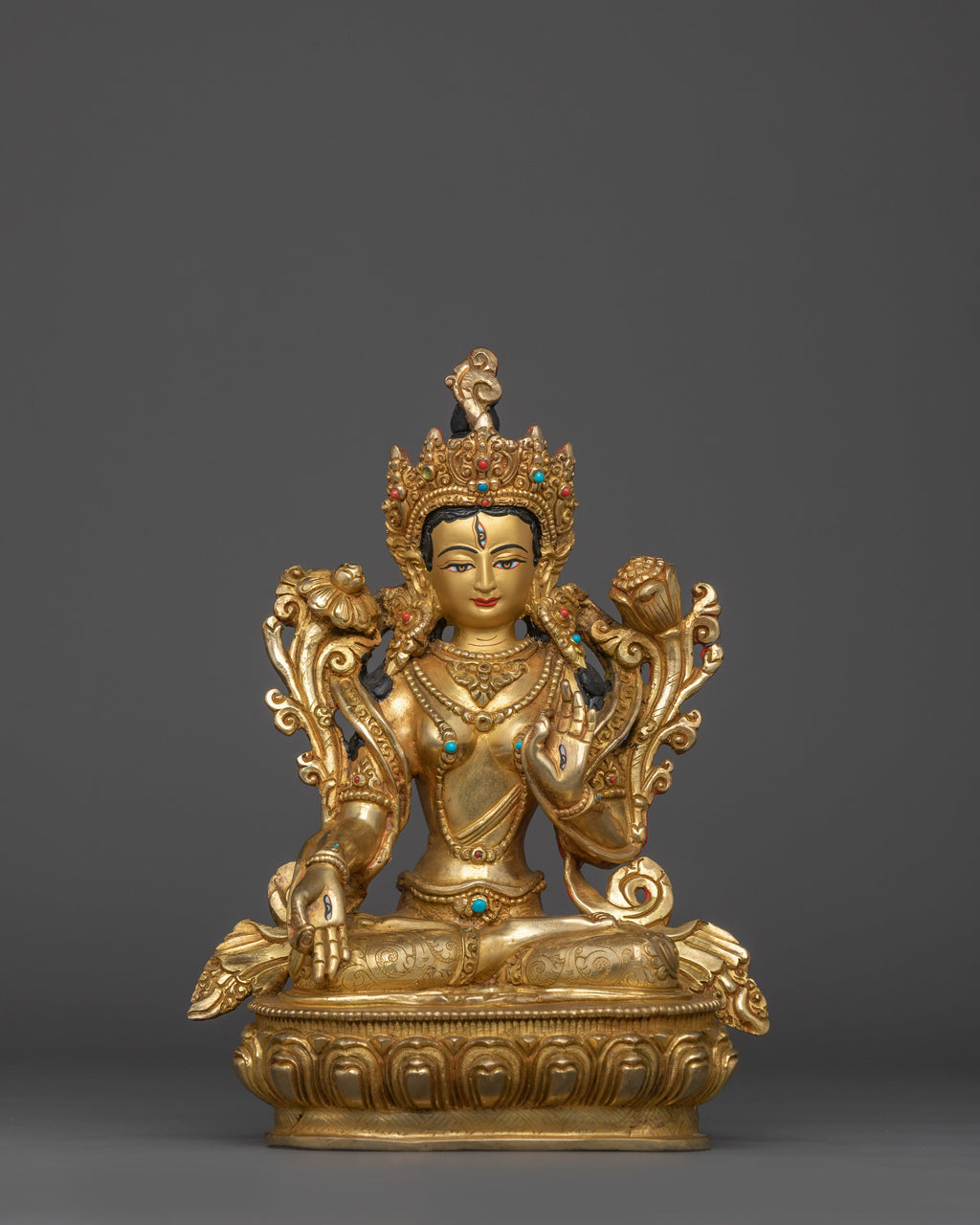 The Mother of All Buddhas, White Tara Statue, stands at a height of 8.3 inches (21 cm) and has a base width of 6.5 inches (16.5 cm), weighing 1.55 kilograms. The sculpture is crafted from a copper body, adorned with 24K gold gilding and gold and acrylic paintings, which add depth and detail to the artwork. Embedded gemstones further enhance its beauty and spiritual significance, making this piece not just a work of art but also a representation of refined craftsmanship and sacred symbolism.