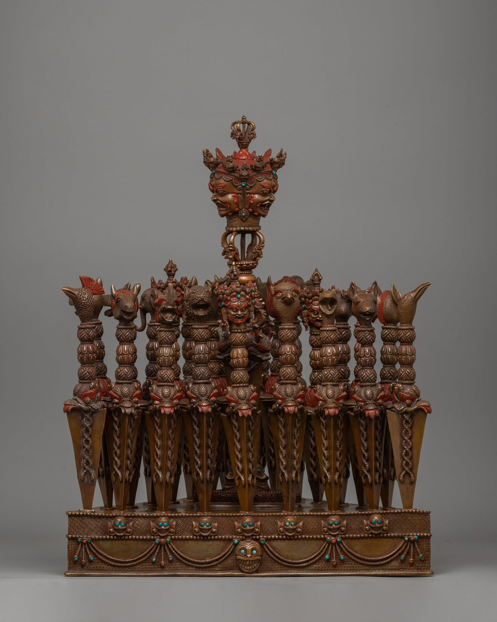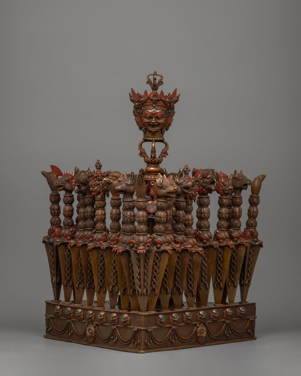 This exquisite Phurba set includes twenty-five dagger-style Phurbas, each carved with the heads of various creatures, such as horses, boars, and elephants, to signify diverse spiritual concepts. A taller Phurba, depicting Heruka, stands in the center, with a half Vajra on top of his head and a full Vajra below his neck, indicating power and enlightenment. The center Phurba has three skull heads carved at its base, adding to its sacred and protecting meaning. This central Phurba stands out from the rest of the set for its height and spiritual significance.