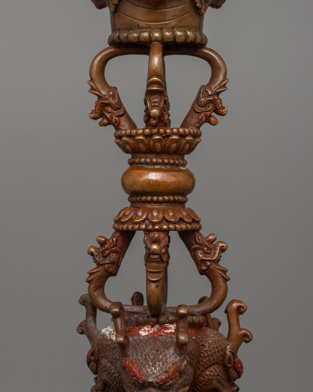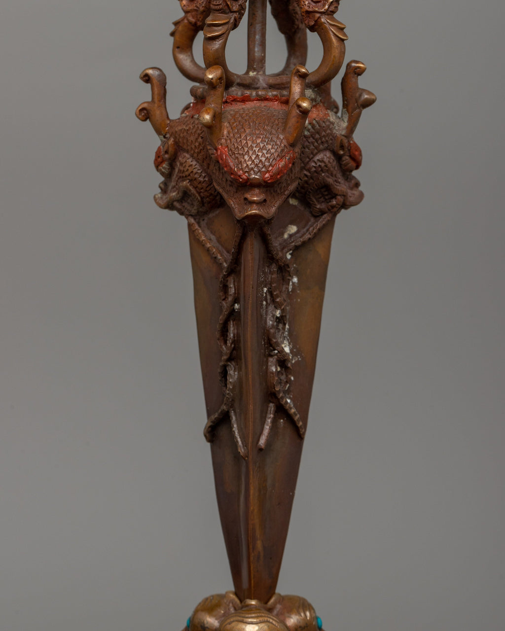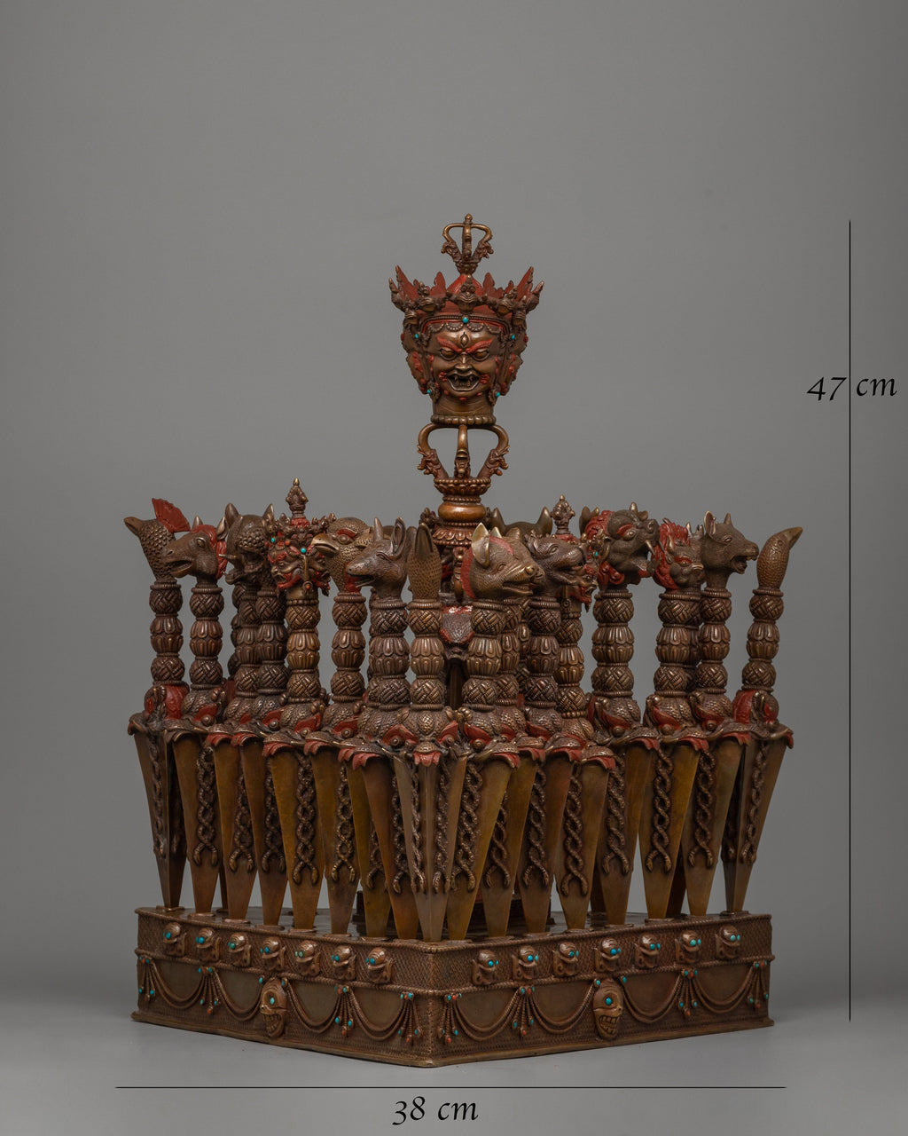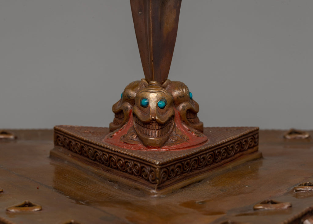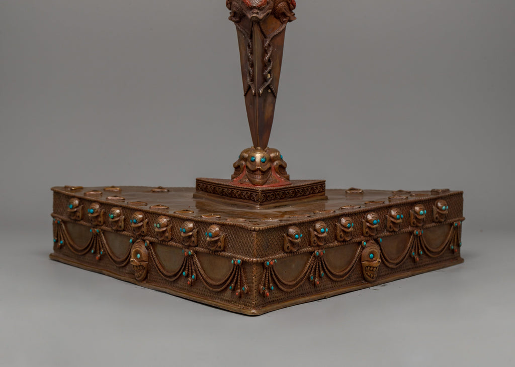 This handcrafted Tantric Phurba set, made of oxidized copper, is an effective Vajrayana Buddhist ritual instrument for protection, energy transformation, and spiritual purification. It is 47 cm tall, 38 cm wide, and 22.24 kg. This hefty and meticulously constructed set is a sacred instrument in Tibetan Buddhism, respected for suppressing negative energies and eliminating spiritual barriers.