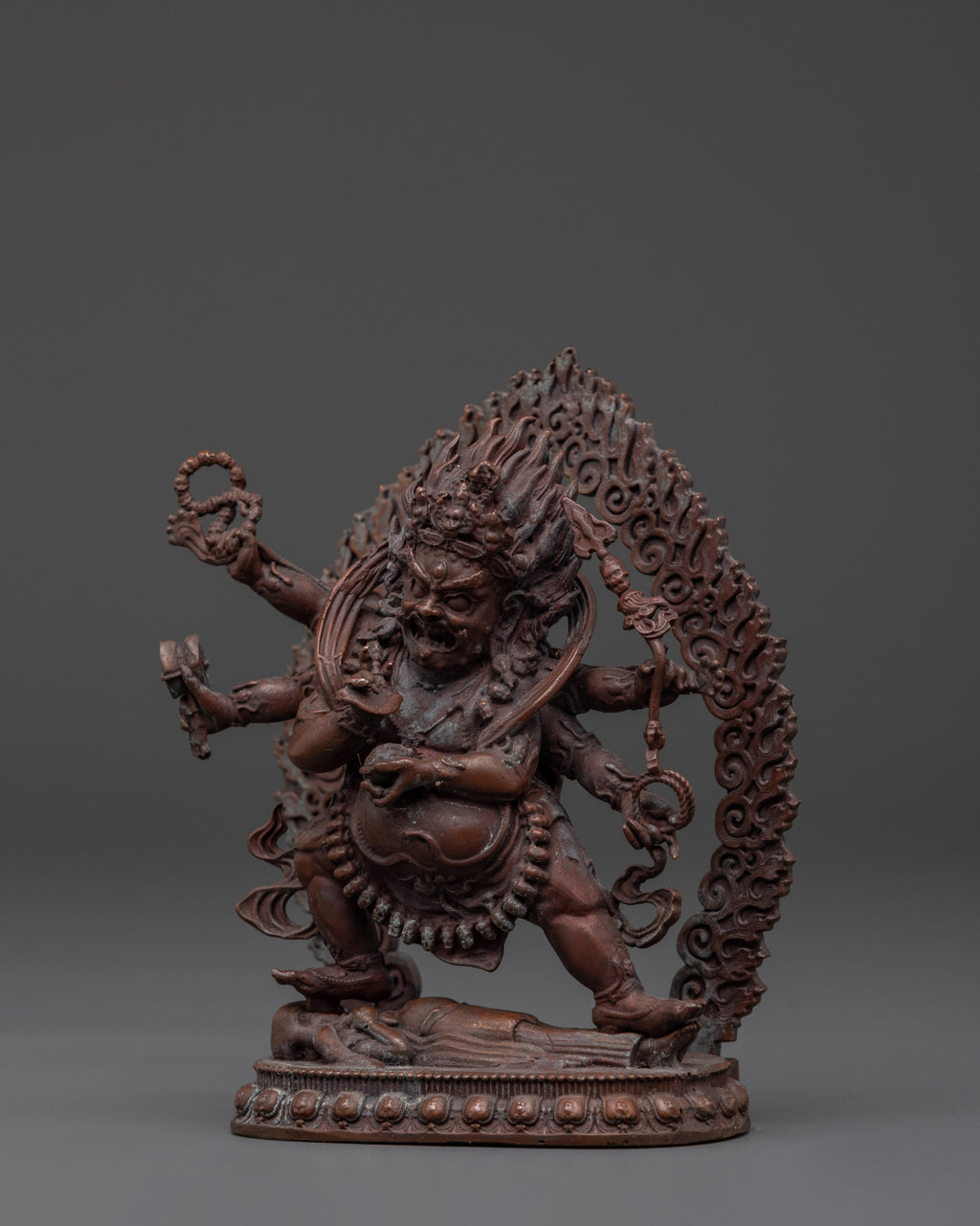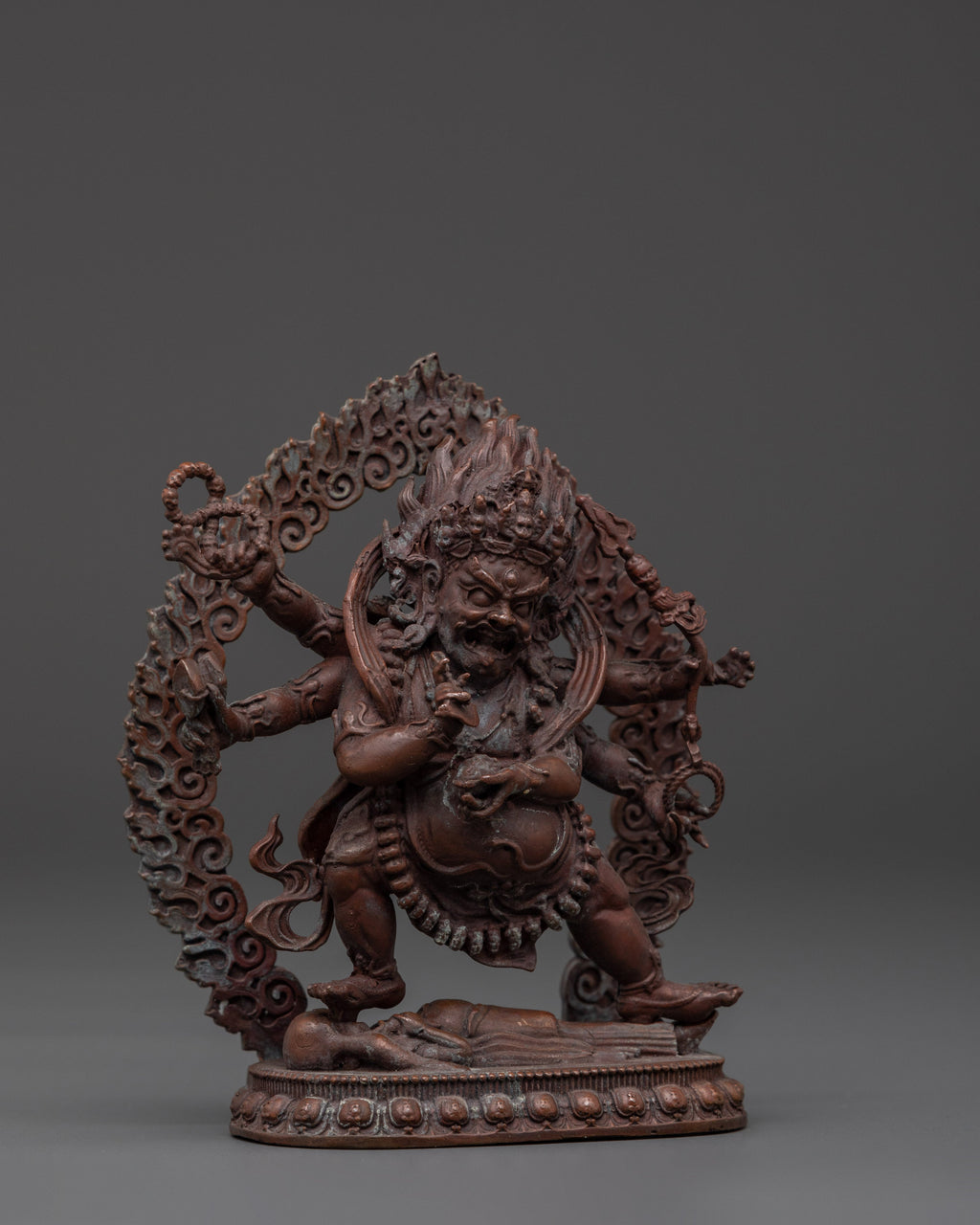 This Wrathful Six-Armed Mahakala Statue is a profound representation of one of Tibetan Buddhism’s most powerful protector deities. Known as the fierce embodiment of compassion, Mahakala acts decisively to remove obstacles, dispel negative energies, and shield practitioners as they progress toward enlightenment. Measuring 11.5cm in height and 9.5cm in width, and weighing 0.40kg, this meticulously handcrafted statue made of oxidized copper showcases the exceptional artistry of Himalayan craftsmen.