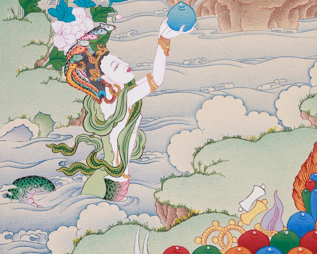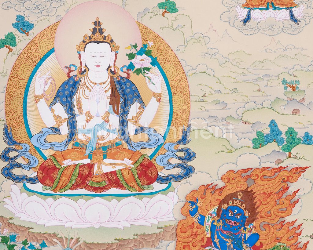 Chenrezig (Avalokiteshvara), the Bodhisattva of Infinite Compassion, sits gracefully on a radiant lotus at the center of the painting. His four arms symbolize his vow to aid all beings—two hold a wish-fulfilling jewel, symbolizing compassion. Conversely, the remaining figures hold a crystal rosary and a lotus flower, symbolizing devotion and purity. His calm expression and luminous halo exude serenity, embodying infinite compassion that transcends suffering.
