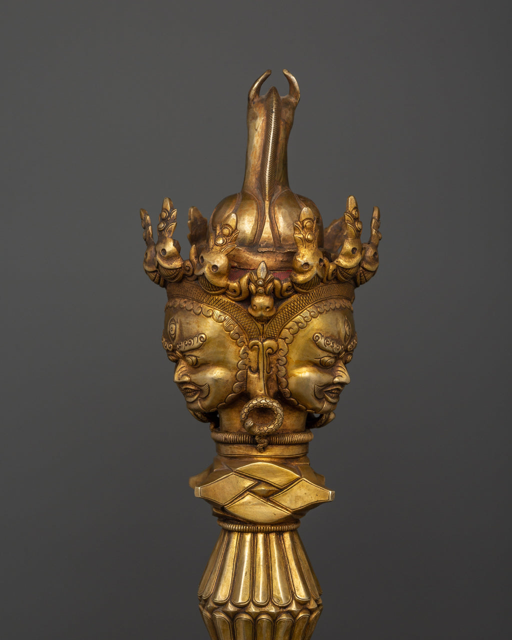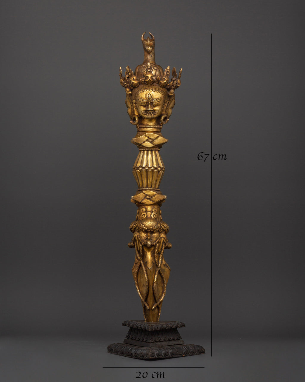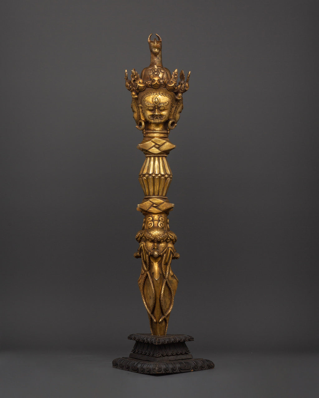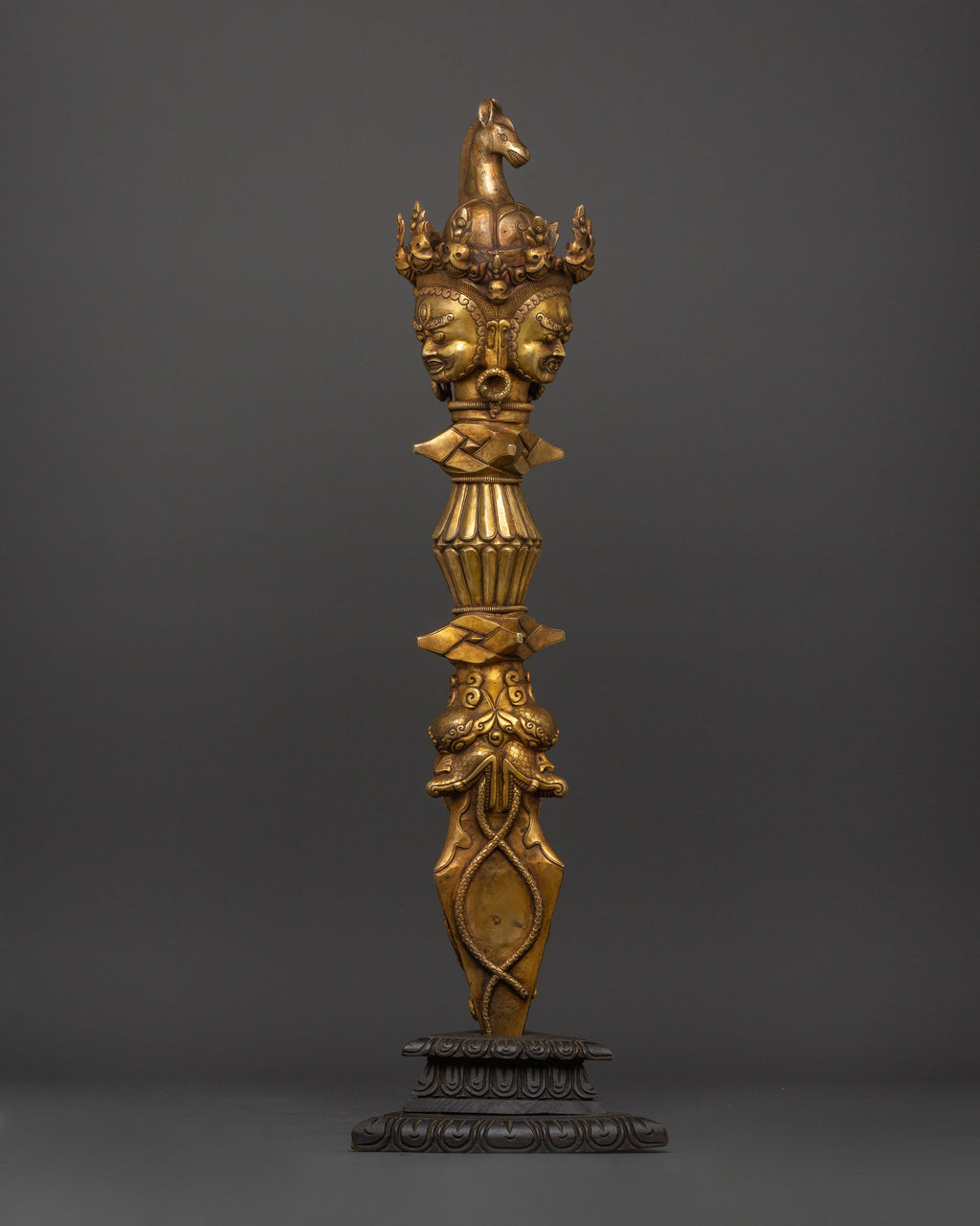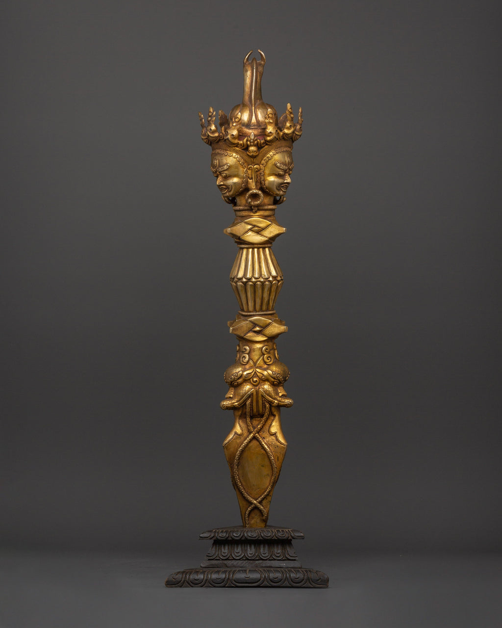 This magnificent Three-Faced Phurba Dagger is an exceptional piece of sacred Tibetan art, designed for both spiritual practice and ritual purposes. Crafted from copper and gold-plated to perfection, this powerful ceremonial dagger features three faces, each symbolizing different aspects of Tibetan Buddhism. The Phurba represents the ability to cut through the illusions and obstacles of the material world, aiding in the transformation of negative energies into positive forces. The three faces atop the Phurba dagger embody various deities or guardians, each watching over the practitioner and offering protection, wisdom, and insight.