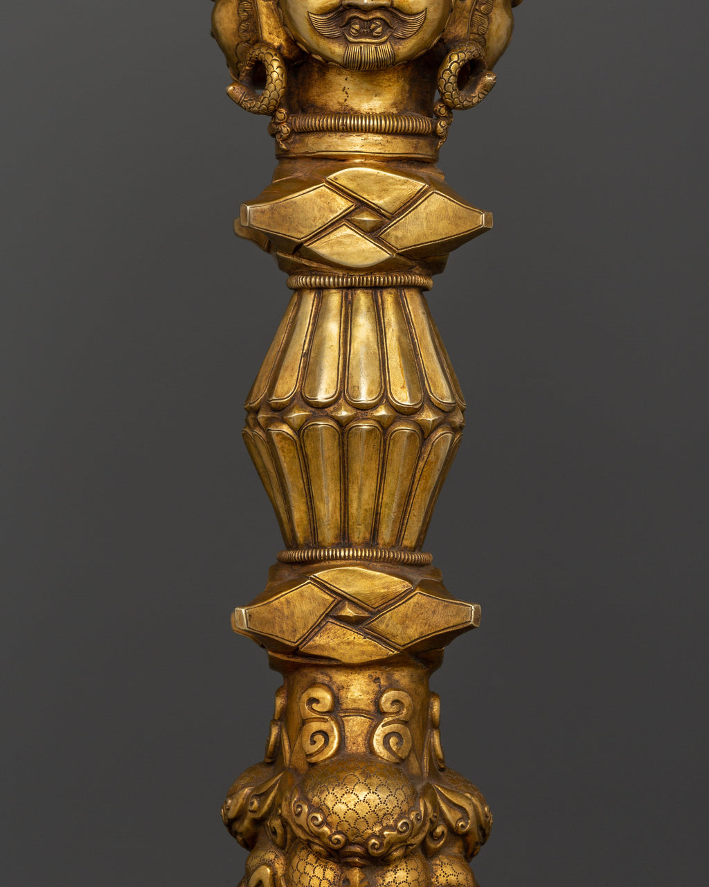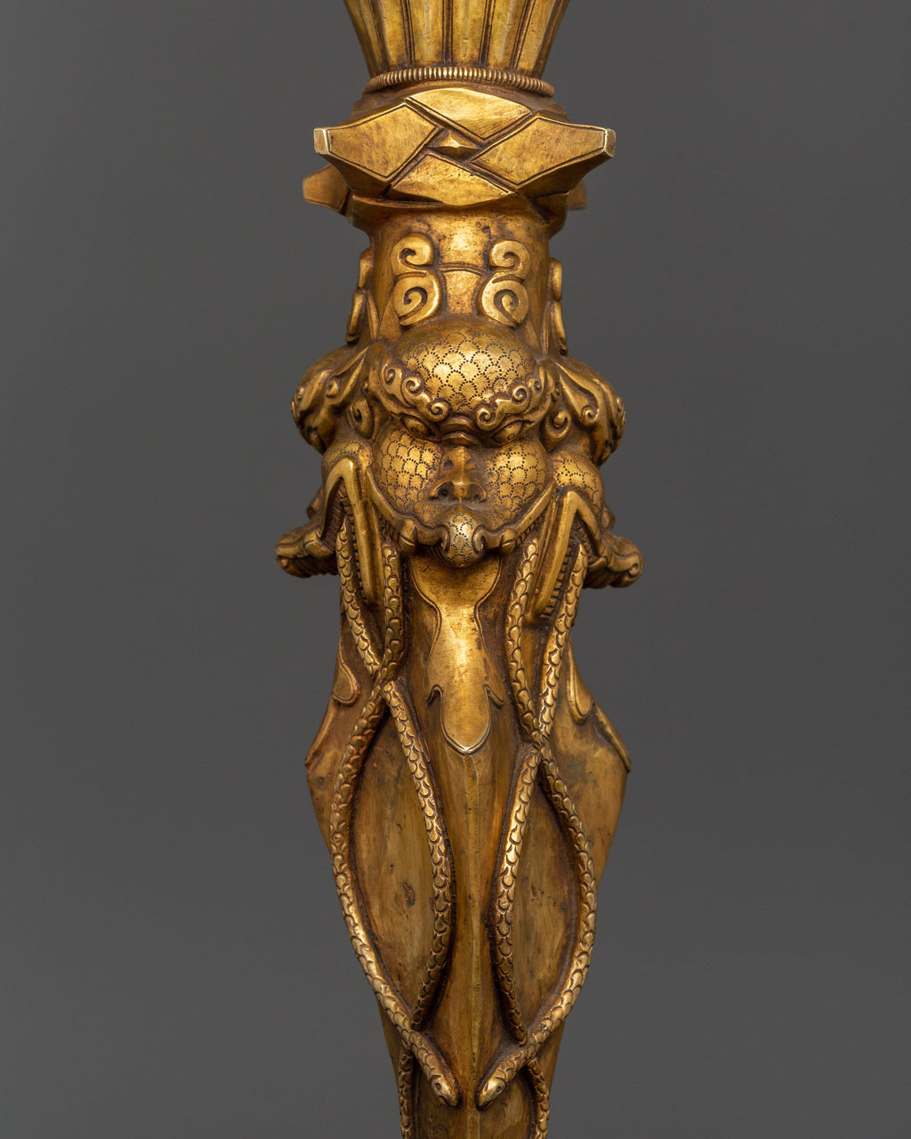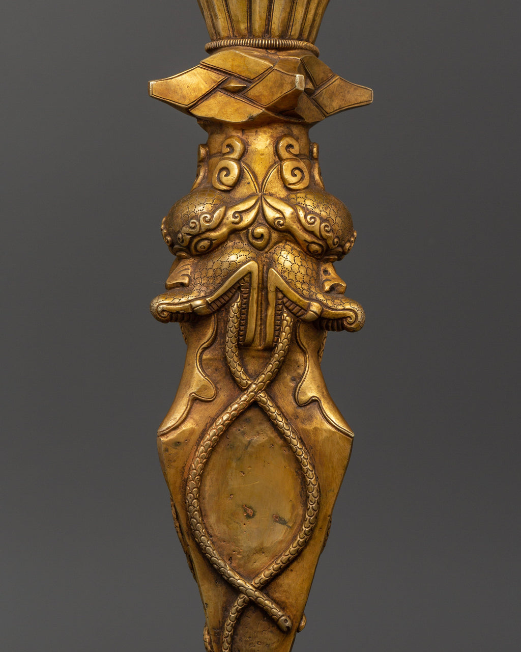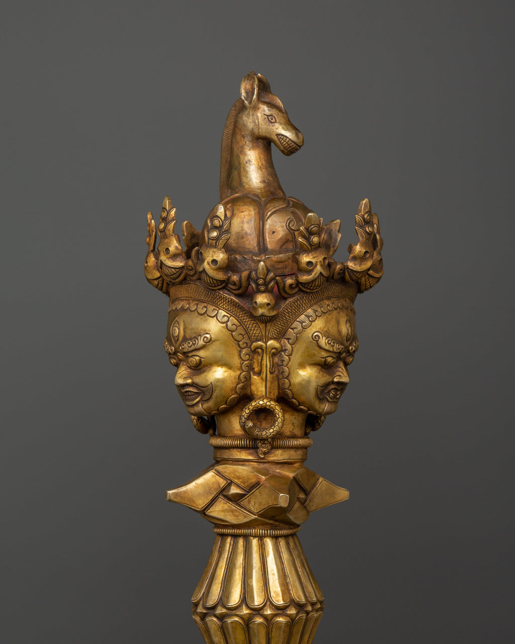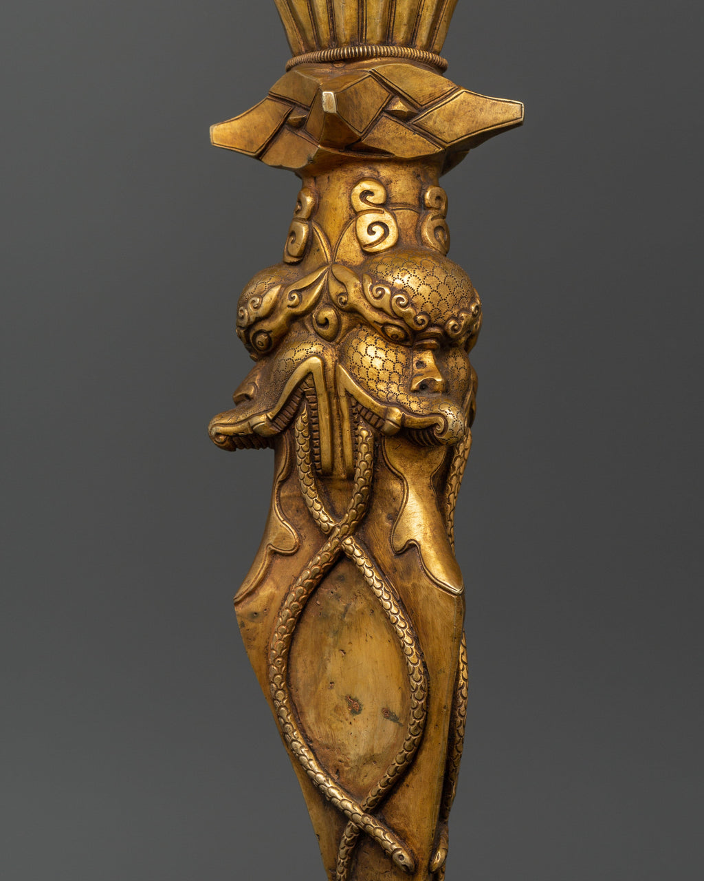 This magnificent Three-Faced Phurba Dagger is an exceptional piece of sacred Tibetan art, designed for both spiritual practice and ritual purposes. Crafted from copper and gold-plated to perfection, this powerful ceremonial dagger features three faces, each symbolizing different aspects of Tibetan Buddhism. The Phurba represents the ability to cut through the illusions and obstacles of the material world, aiding in the transformation of negative energies into positive forces. The three faces atop the Phurba dagger embody various deities or guardians, each watching over the practitioner and offering protection, wisdom, and insight.