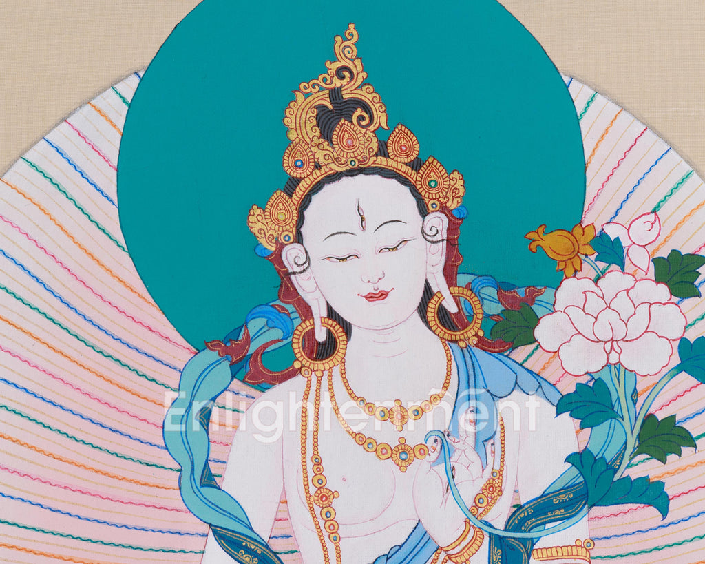 Following the traditional Karma Gadri style, this Sacred Three Long-Life Deities Thangka represents an exquisite work of art. It is carefully hand-painted using acrylic colors and decorated with authentic 24K gold. White Tara, positioned centrally, embodies compassion and healing. Flanking her, Amitayus and Namgyalma enhance the auspicious symbolism of longevity, health, and spiritual purification. This elegant thangka, with its vibrant colors and intricate patterns, functions as a harmonious and spiritually powerful focal point for any meditation altar or sacred space.