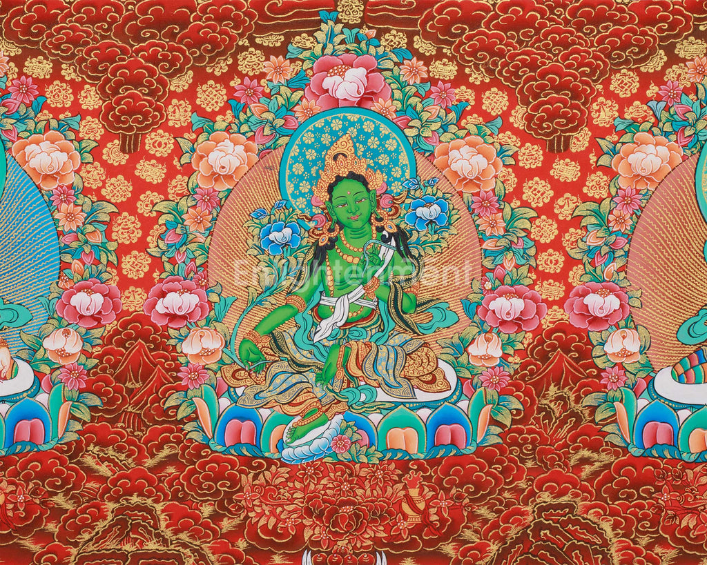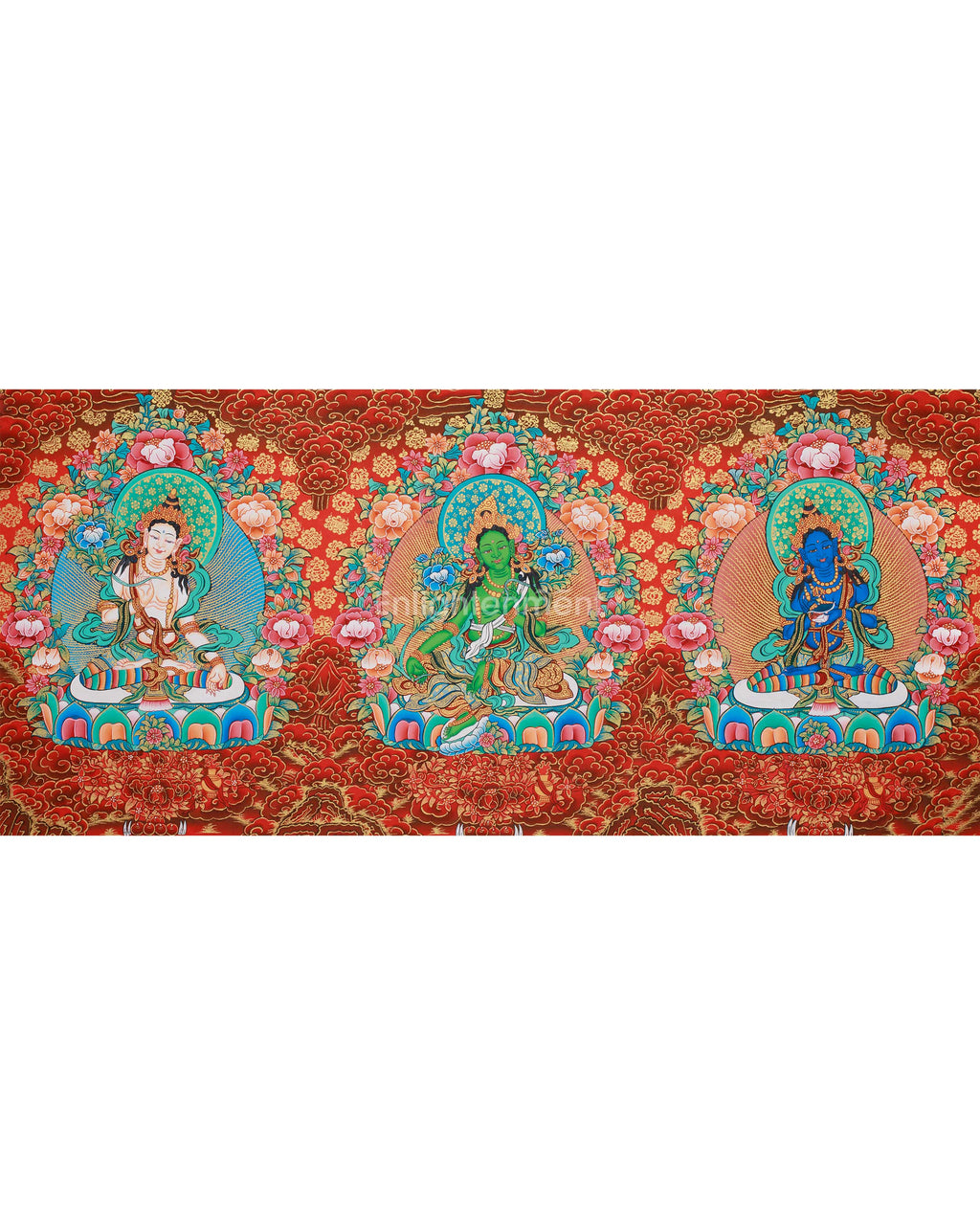 Gracefully seated on ornate lotus thrones, the Three Tara Deities radiate divine energy as they adorn beautiful silk attire and intricate jewels. Their calm yet strong expressions convey spiritual strength and peace while embodying compassion, wisdom, and protection. The thangka's background is meticulously adorned with elaborate floral designs and sacred patterns, enhancing its sacred significance. While the background glows with opulent gold and deep red, the deities stand out in white, green, and blue hues, creating a striking contrast that emphasizes their unique spiritual qualities.