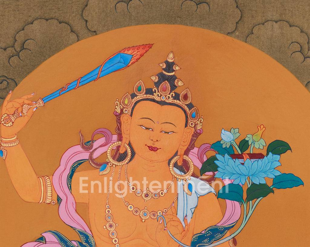 In the center, Manjushri, the Bodhisattva of Wisdom, wields a fiery sword to cut through ignorance while holding a sacred scripture as a symbol of knowledge. Chenrezig, the Bodhisattva of Compassion, is shown sitting on a wish-fulfilling jewel and a lotus, radiating kindness and love that go beyond boundaries. With a vajra, Vajrapani, the Bodhisattva of Enlightened Action, is depicted, symbolizing strength and resolve in the face of challenges. Bright colors and gold accents enhance their divine presence, creating a peaceful symbol of devotion and spiritual awakening for your home or meditation space.