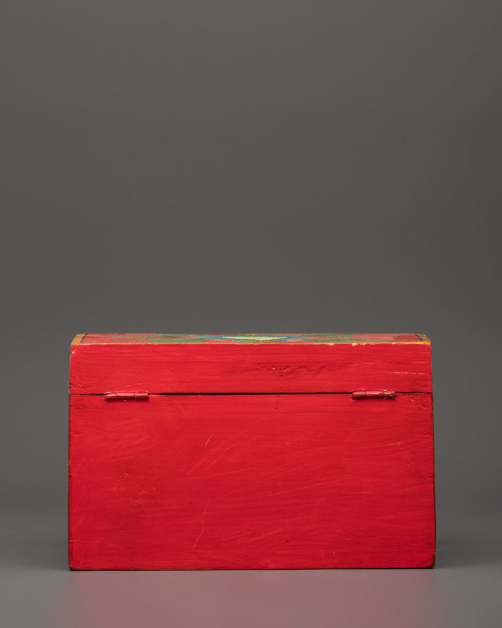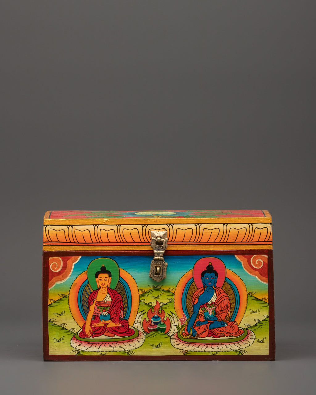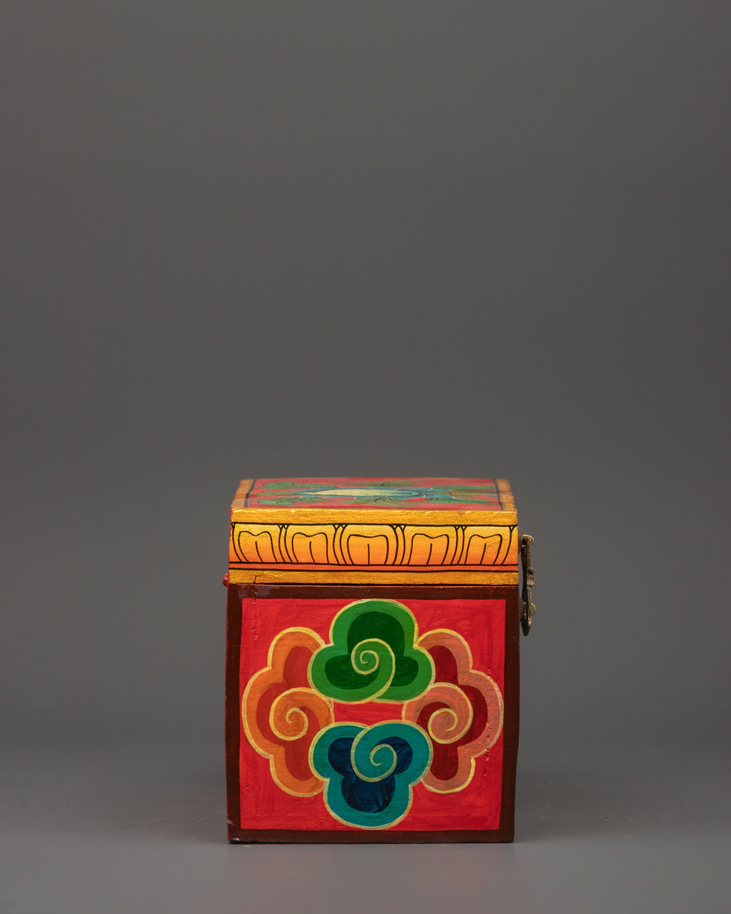 This box, made of wood, is a spiritual storage piece. This Tibetan wooden Box holds sentimental value, offering a safe and sacred place to store your cherished items. The bright artwork instills a spiritual vibe in your environment while monumentalizing two key personalities in Tibetan Buddhism. This box is a stunning portrayal of Buddhist teachings and values, making it ideal for practitioners or anyone looking to include Tibetan culture into their lives.