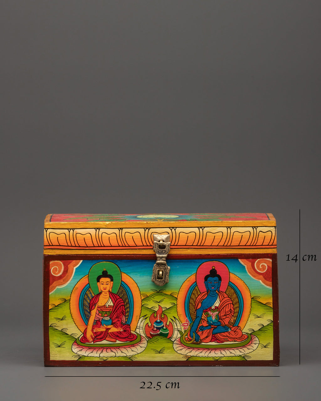 This Tibetan Altar Wooden Box has magnificent hand-painted representations of Shakyamuni Buddha and Medicine Buddha on the front. The detailed artwork is brought to life with brilliant acrylic paintings representing serenity, health, and healing. The box is 14 cm tall and 22.5 cm wide, making it ideal for storing tiny spiritual goods, incense, or religious writings. This wonderfully constructed box weighs 0.75 kg and can be conveniently put on any altar, meditation room, or shelf.