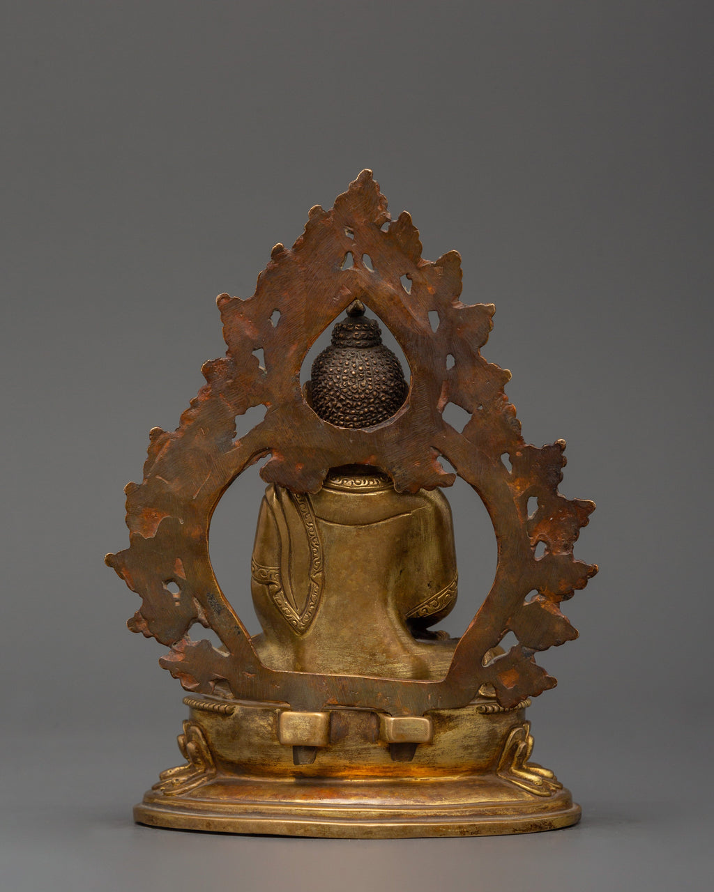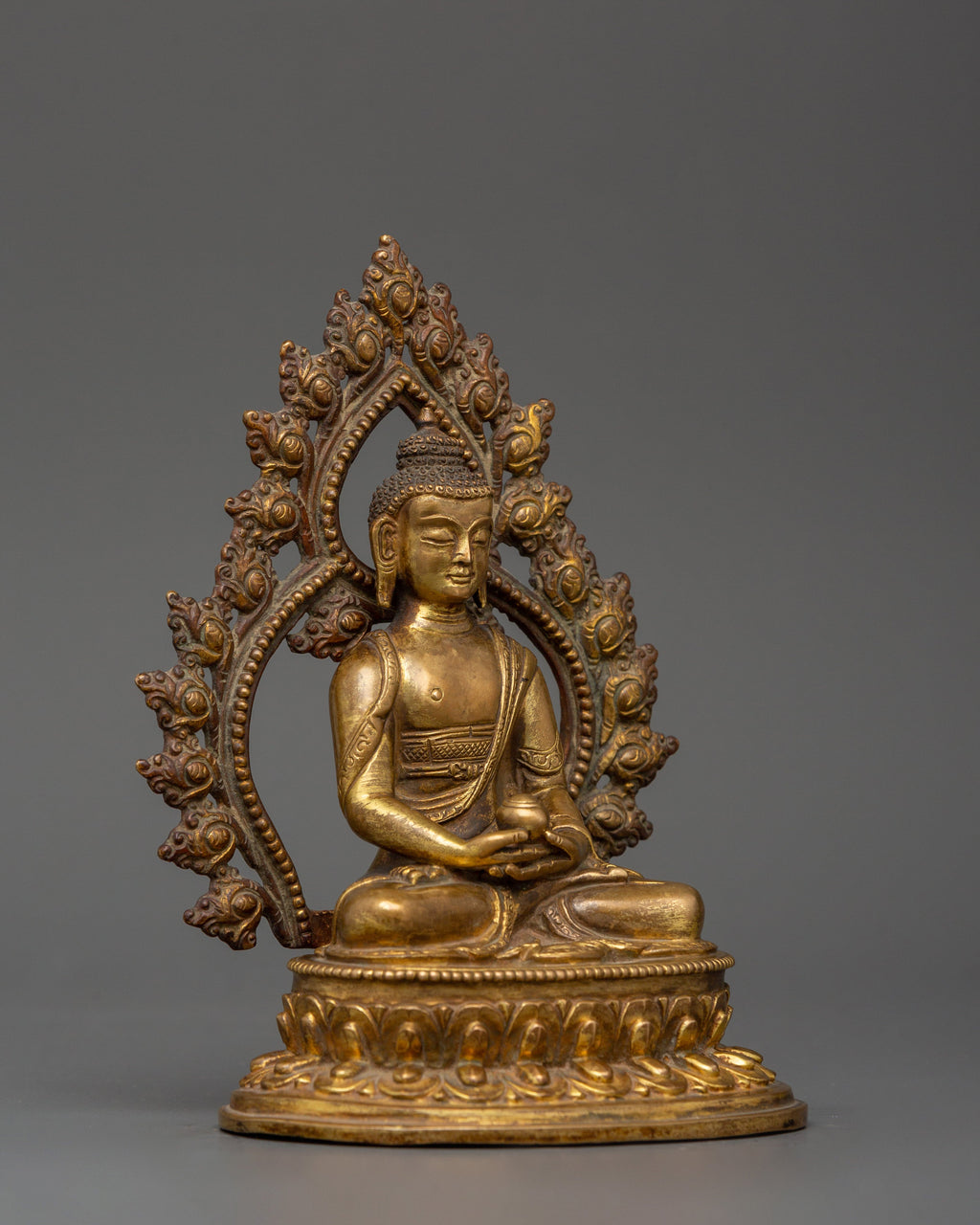 Standing 15.5 cm tall, this exquisitely made Tibetan Amitabha Buddha for Enlightenment Statue potently depicts Amitayus, the Buddha of Infinite Light. This revered figure, which is handcrafted from a copper body and beautifully gold plated, radiates calm energy and everlasting compassion. The deep spiritual symbolism of this adored Buddha in the Pure Land tradition is reflected in its calm expression, seated lotus stance, and elaborate aureole pattern.