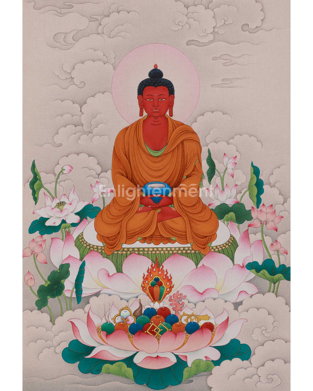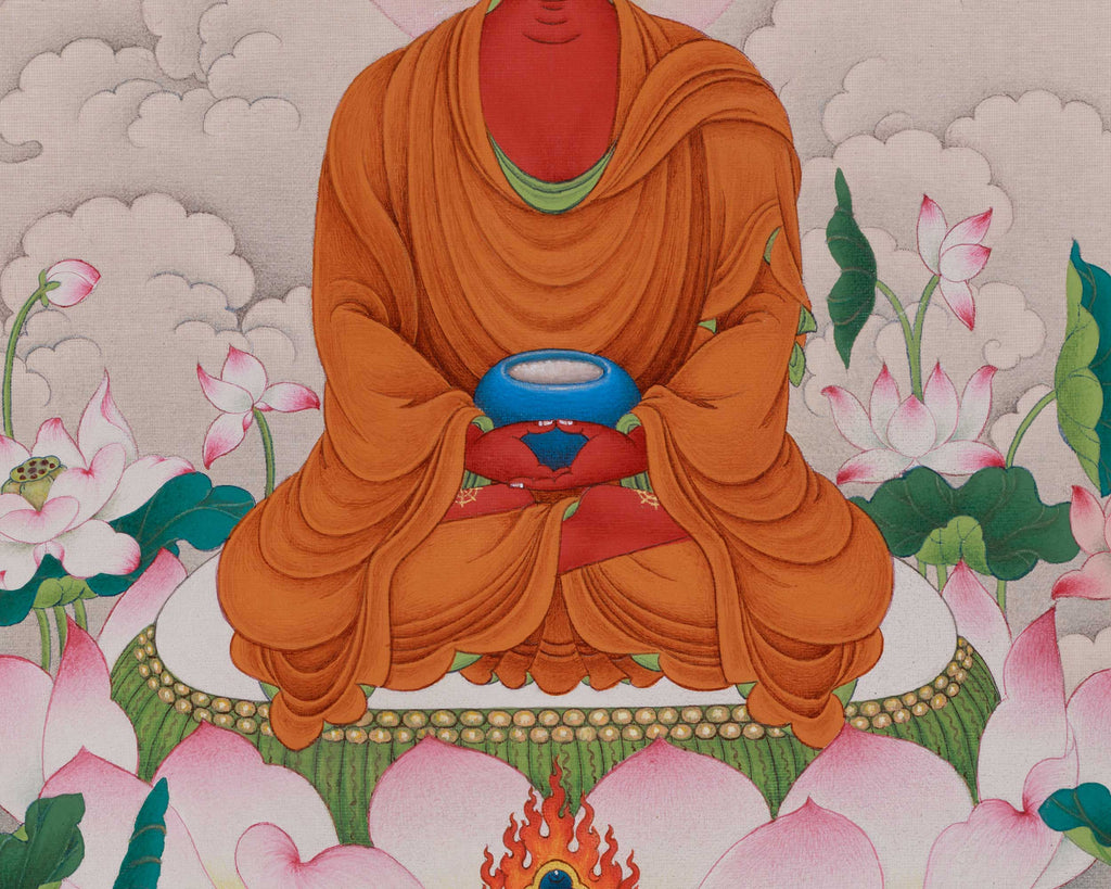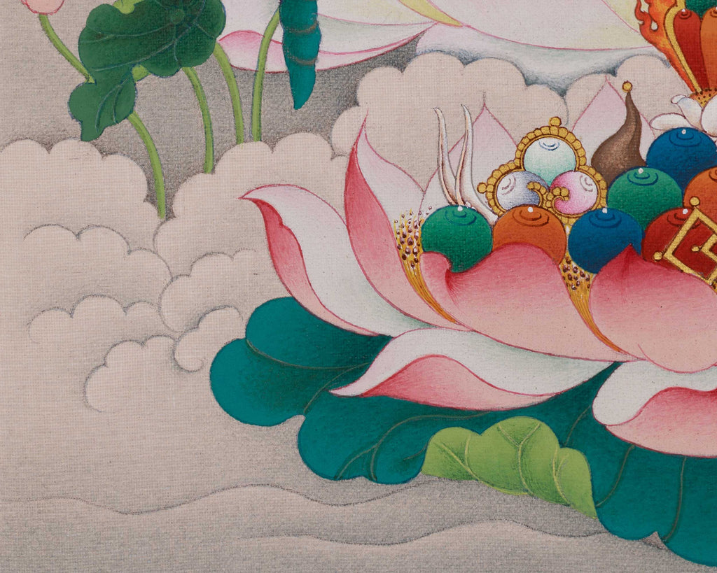 One of the most revered Buddhas in Mahayana Buddhism, particularly in the Pure Land school, is Amitabha Buddha, also called the Buddha of Infinite Light. He lives in the Western Pure Land, also known as Sukhavati, a place of pleasure and serenity where there is no pain. The practice of Amitabha, who is linked to unending compassion, is essential to the desire for rebirth in his Pure Land, where enlightenment is more readily attained. Amitabha's appeal stems from his promise to provide hope and spiritual comfort to all beings that call upon his name with a pure heart. His mantra, "Om Ami Dewa Hrih," is a potent instrument for calling upon his protection and blessings, helping individuals who are looking for freedom and tranquility. Amitabha Buddha is shown in this thangka sitting gracefully on a lotus seat, signifying enlightenment and purity. His ruby-red figure exudes a serene, kind aura that accentuates his boundless intellect and compassion. Holding a monk's bowl in a meditative gesture, his hands represent simplicity and the rejection of material possessions. Each of his feet bears the Dharma Wheel. The observer is made to feel at ease by Amitabha's calm face, which is embellished with a soft grin and a halo of light. The serene and heavenly ambiance of this revered figure is further enhanced by the background of gentle clouds and blossoming lotus flowers.