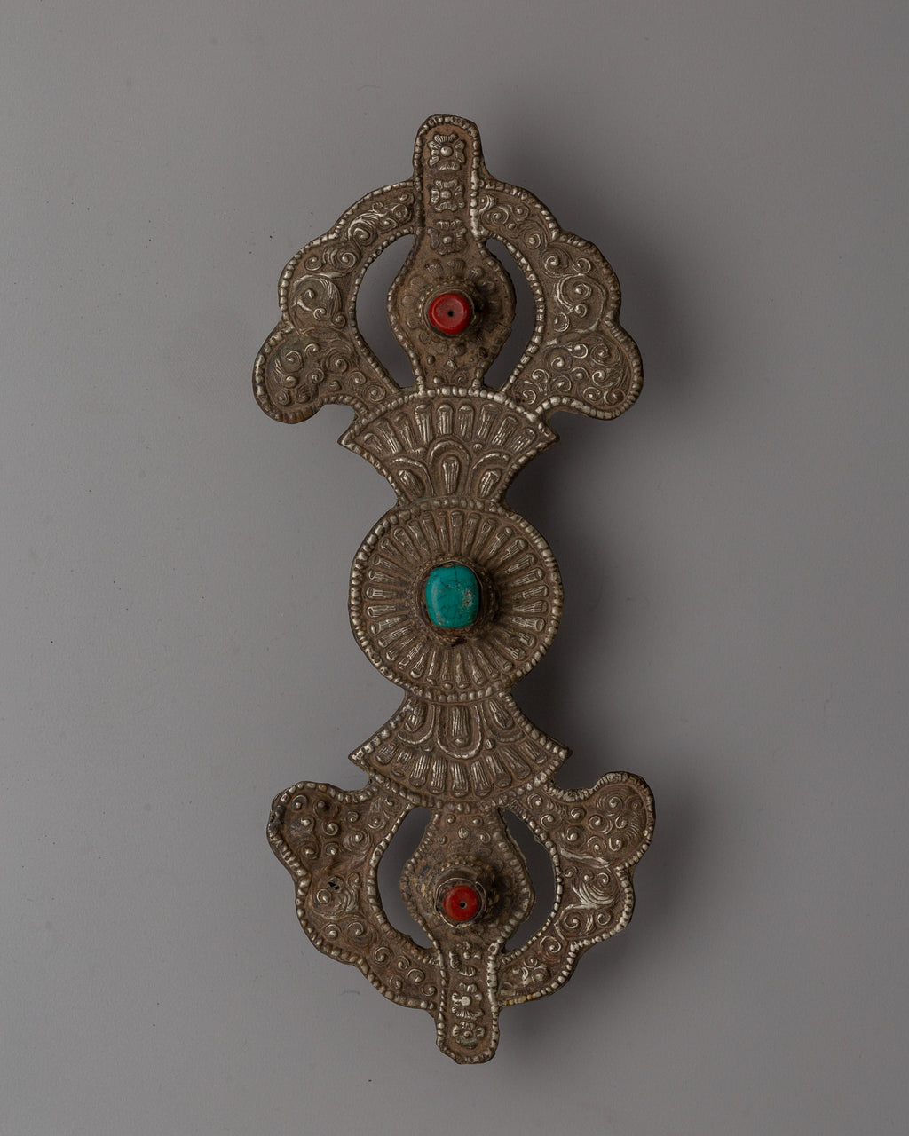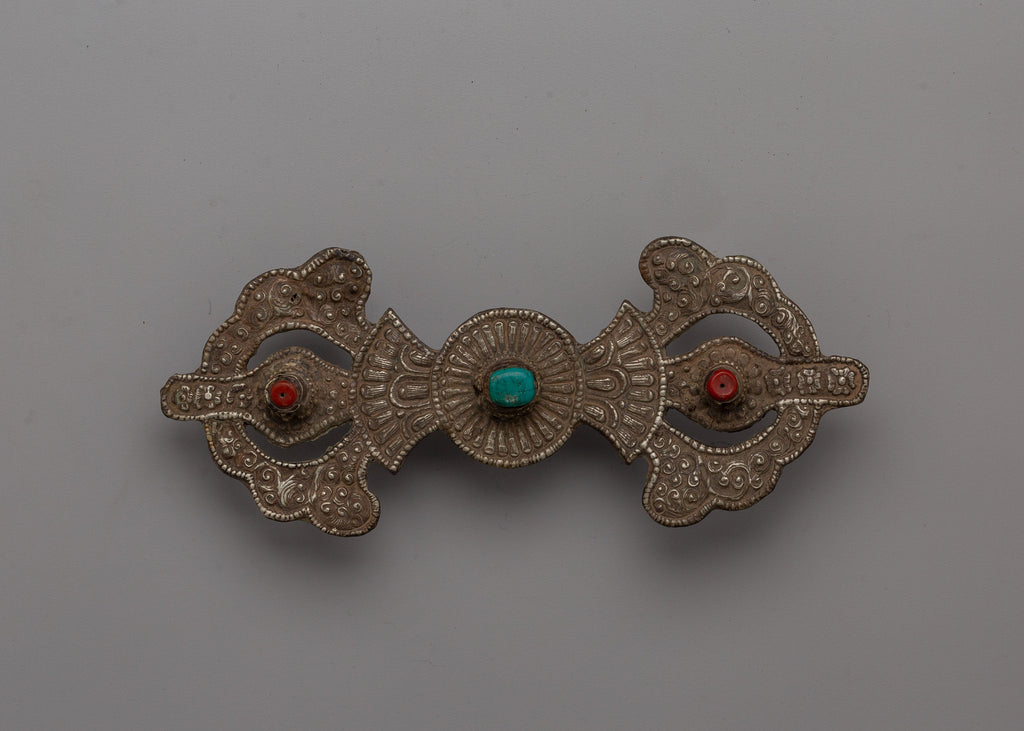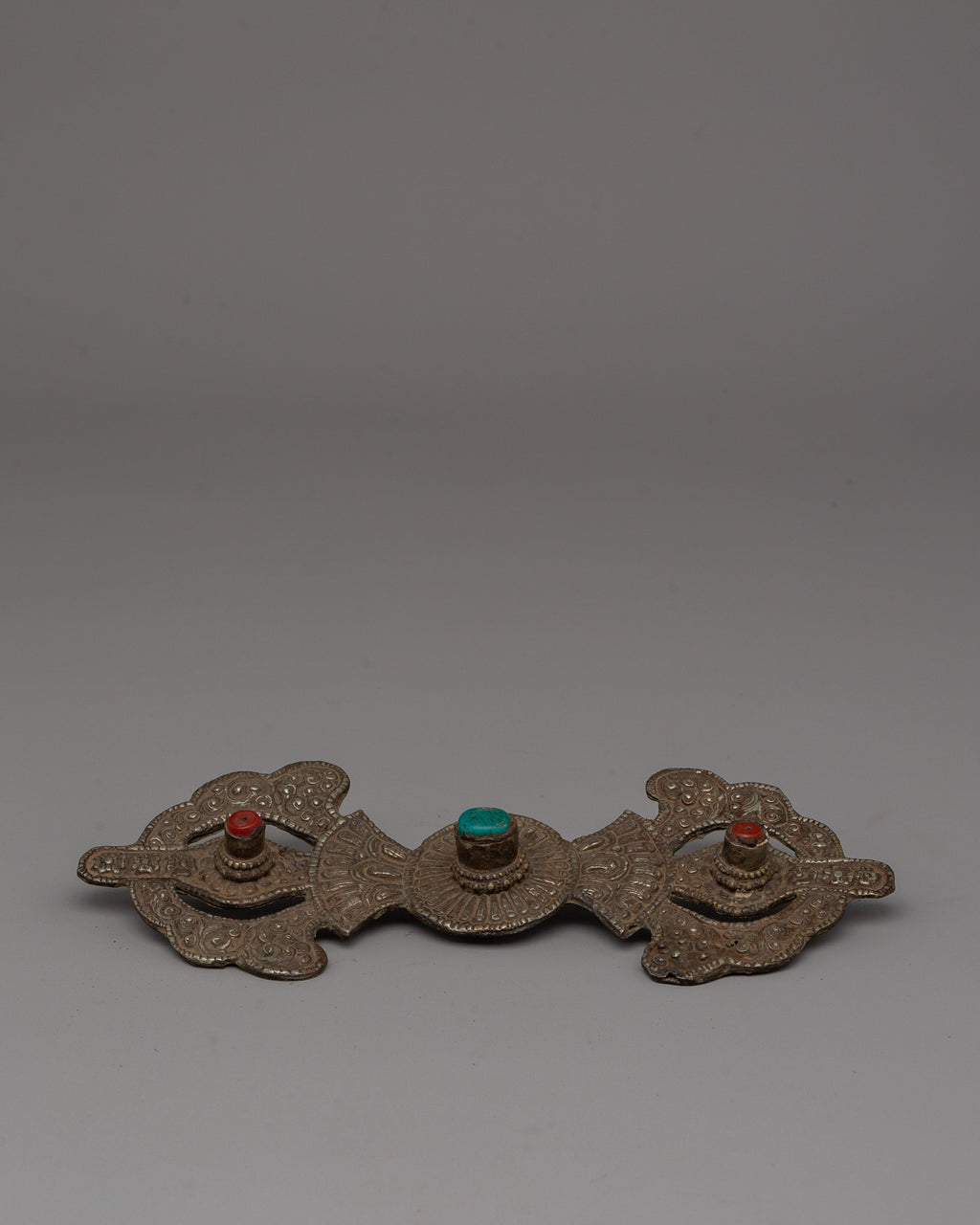 Add a touch of elegance and cultural heritage to your attire with this Traditional Tibetan Apron Clasp, meticulously handcrafted from 70% silver and 30% copper. This exquisite piece is adorned with inlaid artificial turquoise and coral stones, symbolizing protection, balance, and beauty. Its intricate design reflects the rich tradition of Tibetan artistry, making it both a functional accessory and a statement piece of cultural significance.