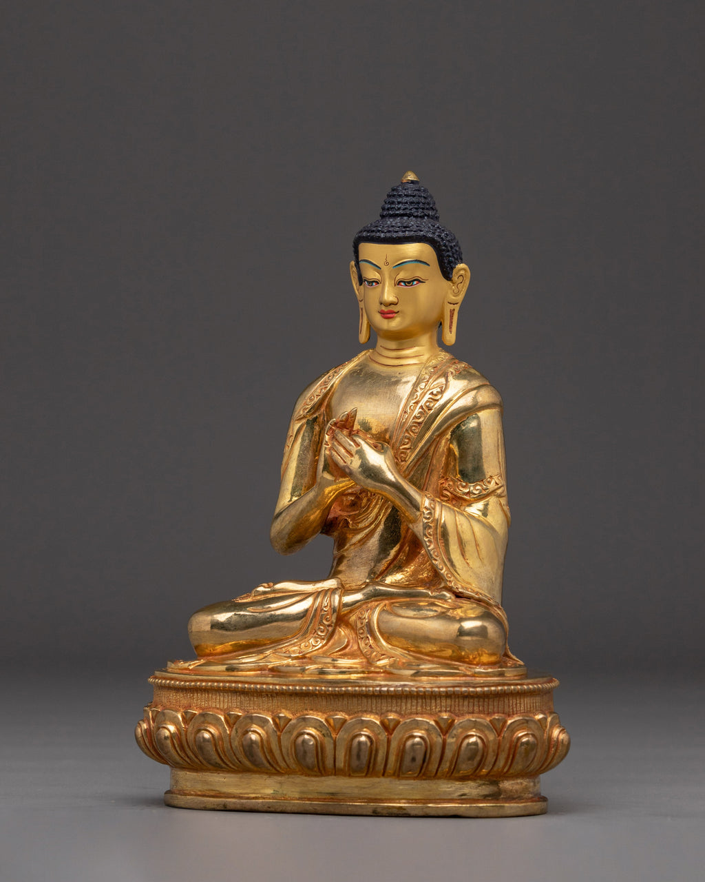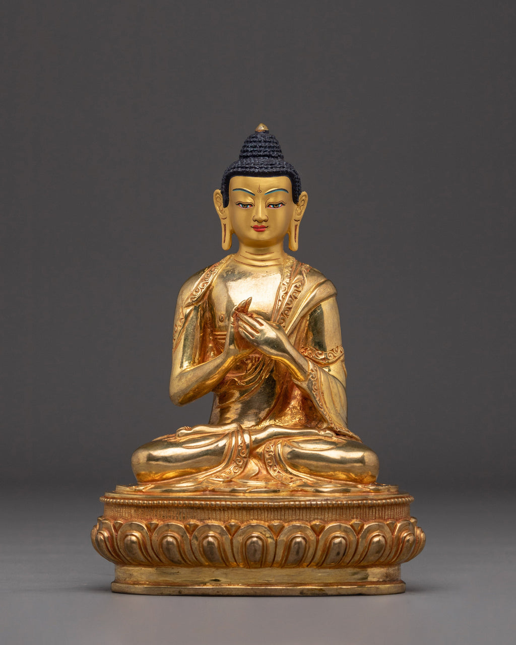 The Tibetan Art of Vairocana Statue stands 8.7” (22 cm) tall, with a base width of 6.3” (16 cm), and weighs 1.47 kg. It is expertly handcrafted from a copper body and 24K gold gilding, gold and acrylic paintings. Vairocana, known as the Cosmic Buddha and embodiment of the Dharmakaya, represents the universal aspect of enlightenment in Tibetan Buddhism. This finely crafted statue is ideal for meditation spaces, altars, or spiritual collections, symbolizing the essence of ultimate reality and wisdom.