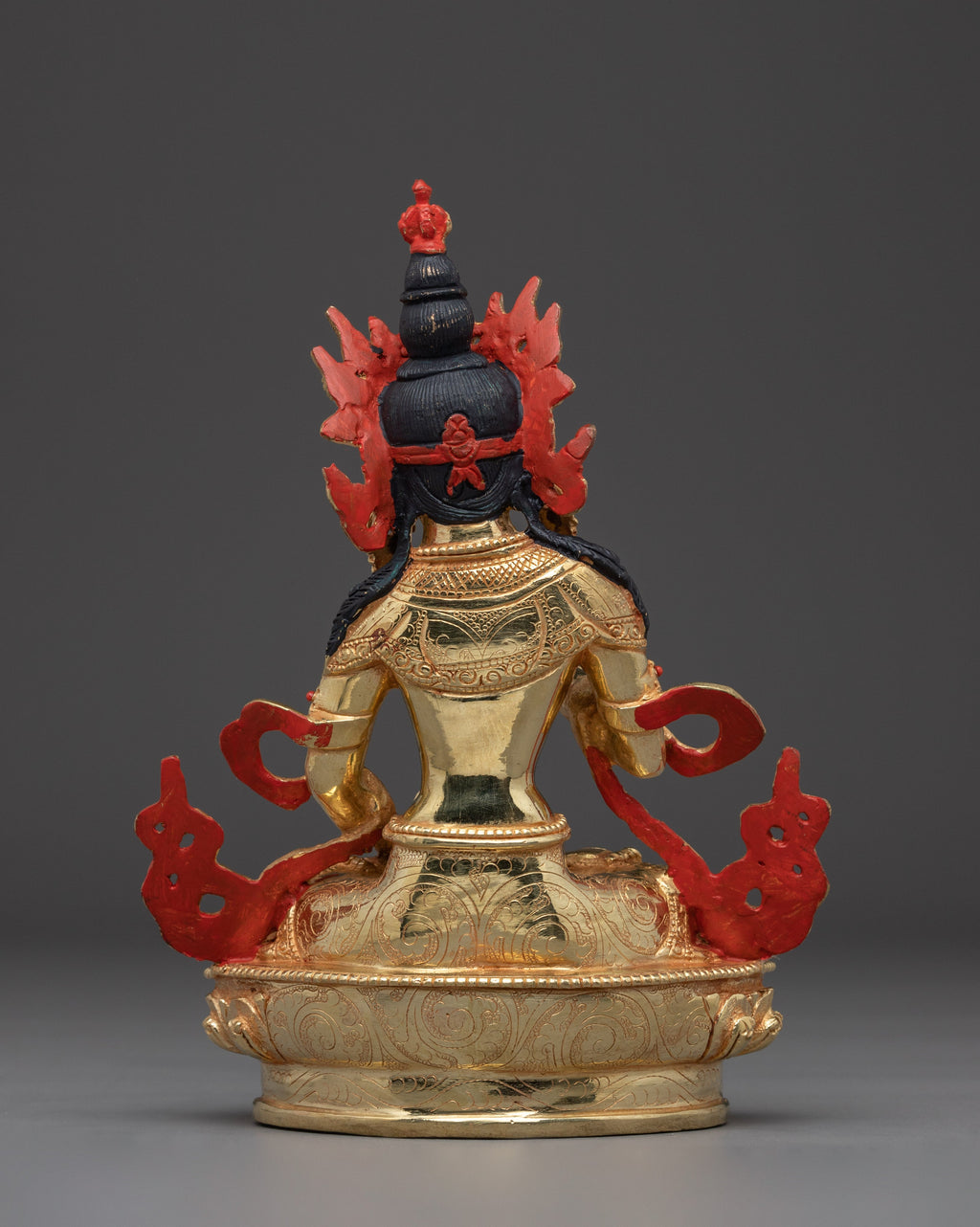 Tibetan Art of Vajrasattva is handcrafted from copper and adorned with 24K gold gilding, intricate gold and acrylic paintings, and gemstones. Measuring 9”/23cm in height and 6.7”/17cm at the base, it weighs 1.50 kg. Vajrasattva is revered in Vajrayana Buddhism as the deity of purification, associated with the 100-syllable mantra and the practice of clearing negative karma. Ideal for personal altars, meditation spaces, or sacred collections.