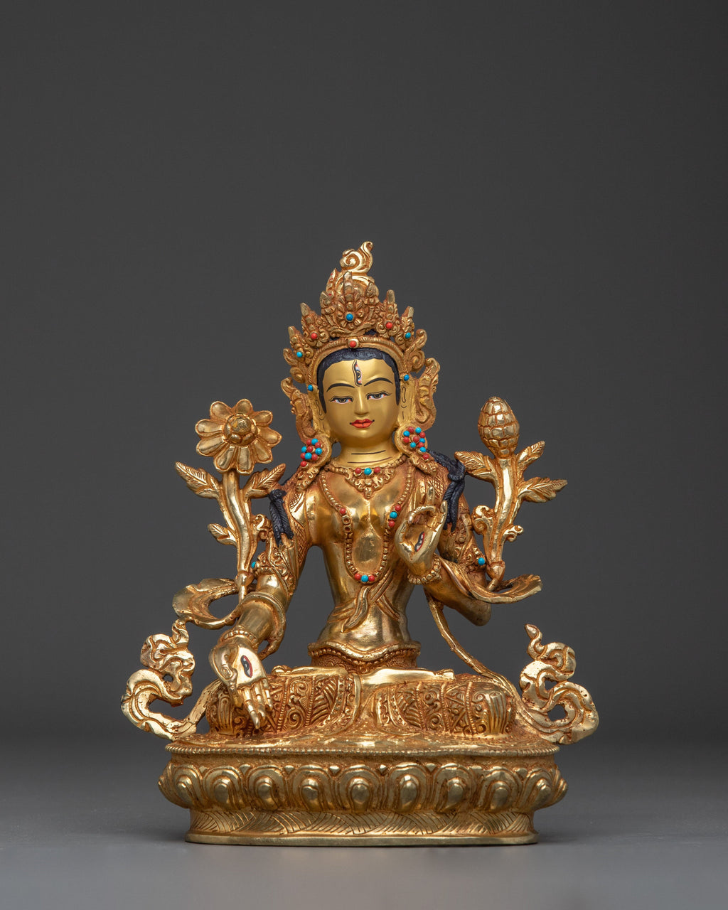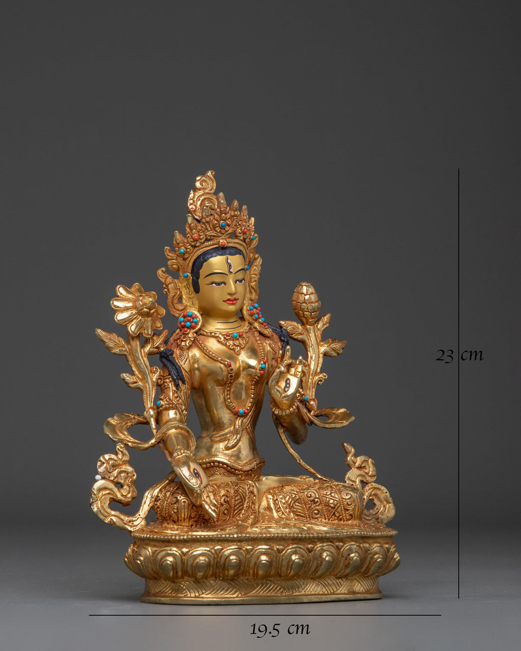 The Buddhist Goddess White Tara Figurine, a symbol of compassion, healing, and longevity, radiates divine grace and spiritual blessings. This wonderfully handcrafted statue, which measures 9.1" (Height) x 7.7" (Base) and weighs 1.69 kg, is made of copper, 24K gold gilding, gold, and acrylic paints. This figure, crafted by talented Nepalese artisans, symbolizes the spiritual traditions of Himalayan Buddhism, making it an important addition to altars, meditation places, or sacred collections.