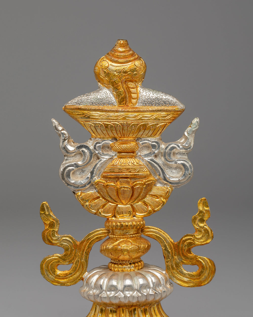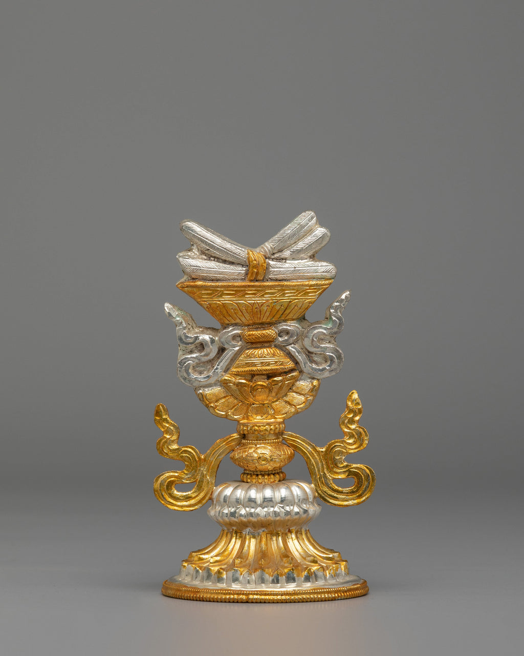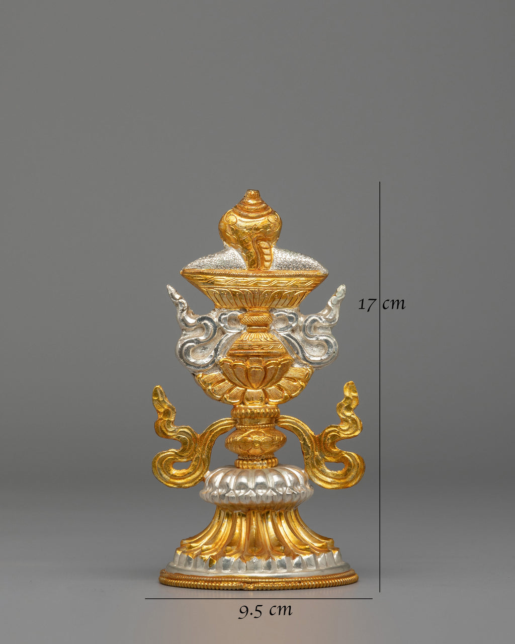 The Tibetan Ashtamangala Symbols are a set of intricately designed copper symbols, electroplated with gold and silver to represent the Eight Auspicious Symbols in Tibetan Buddhism. Standing at 17 cm in height, with 9.5 cm in length and 8.2 cm in width, and weighing 0.22 kg per symbol (total weight of 1.77 kg), these symbols are designed for use in rituals and spiritual ceremonies. The Ashtamangala represents the union of physical and spiritual well-being, and each symbol carries deep significance for good fortune, protection, and blessings.