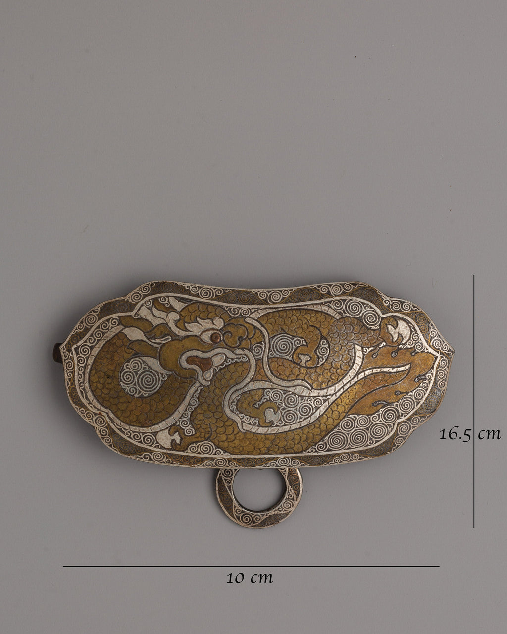 Add a touch of classic beauty to your outfit with this Tibetan Belt Buckle, a work of traditional workmanship. This buckle is made of iron and delicately embellished with 90% silver and brass inlays. Its elaborate motifs include a majestic dragon image representing power and protection in Tibetan tradition. Its dimensions are 16.5 cm in height and 10 cm in breadth, with a weight of 0.24 kg, making it an ideal accessory for collectors or aficionados of cultural objects.