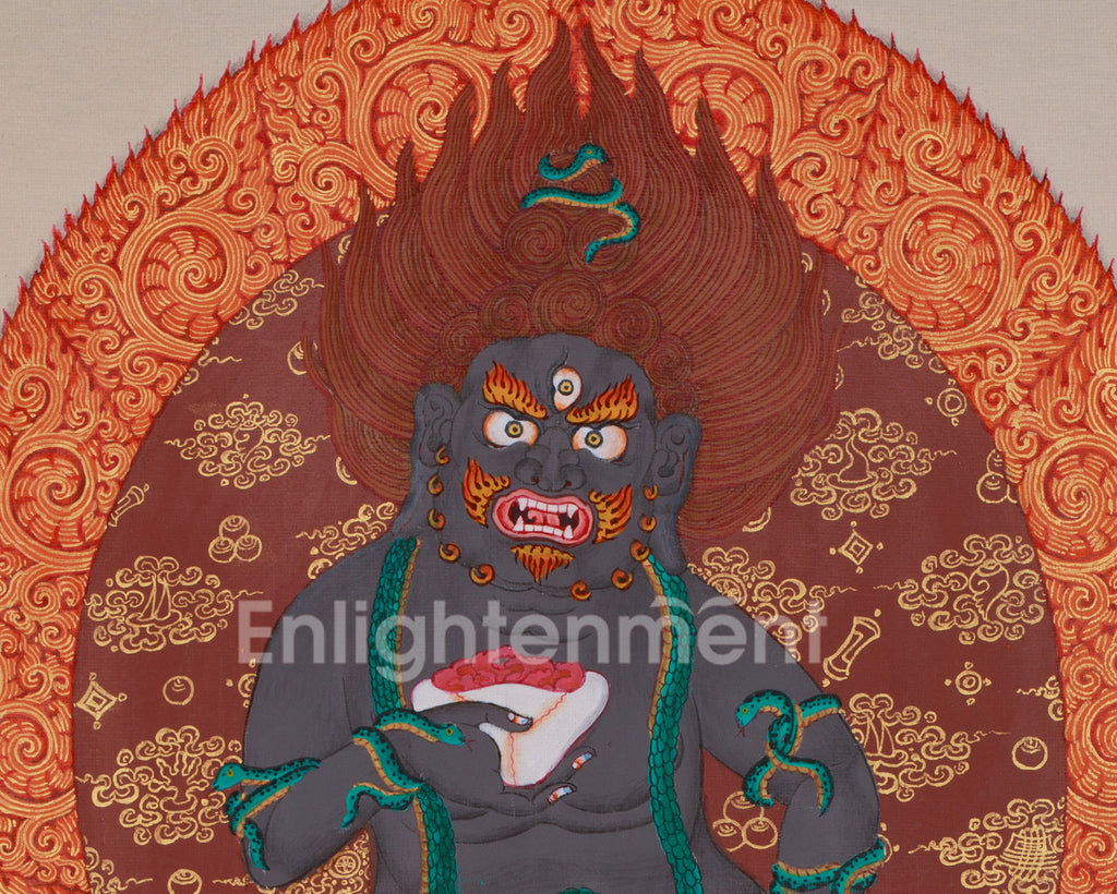 The Tibetan Black Dzambhala Thangka is a vibrant, hand-painted depiction of the God of Wealth and Protection, created in the traditional Karma Gadri style. Enhanced with genuine 24K gold, it captures Black Dzambhala's fierce energy, symbolizing his power to remove obstacles and bring prosperity. The gold accents highlight his divine energy, making this both an artwork and a spiritual tool for wealth and abundance.