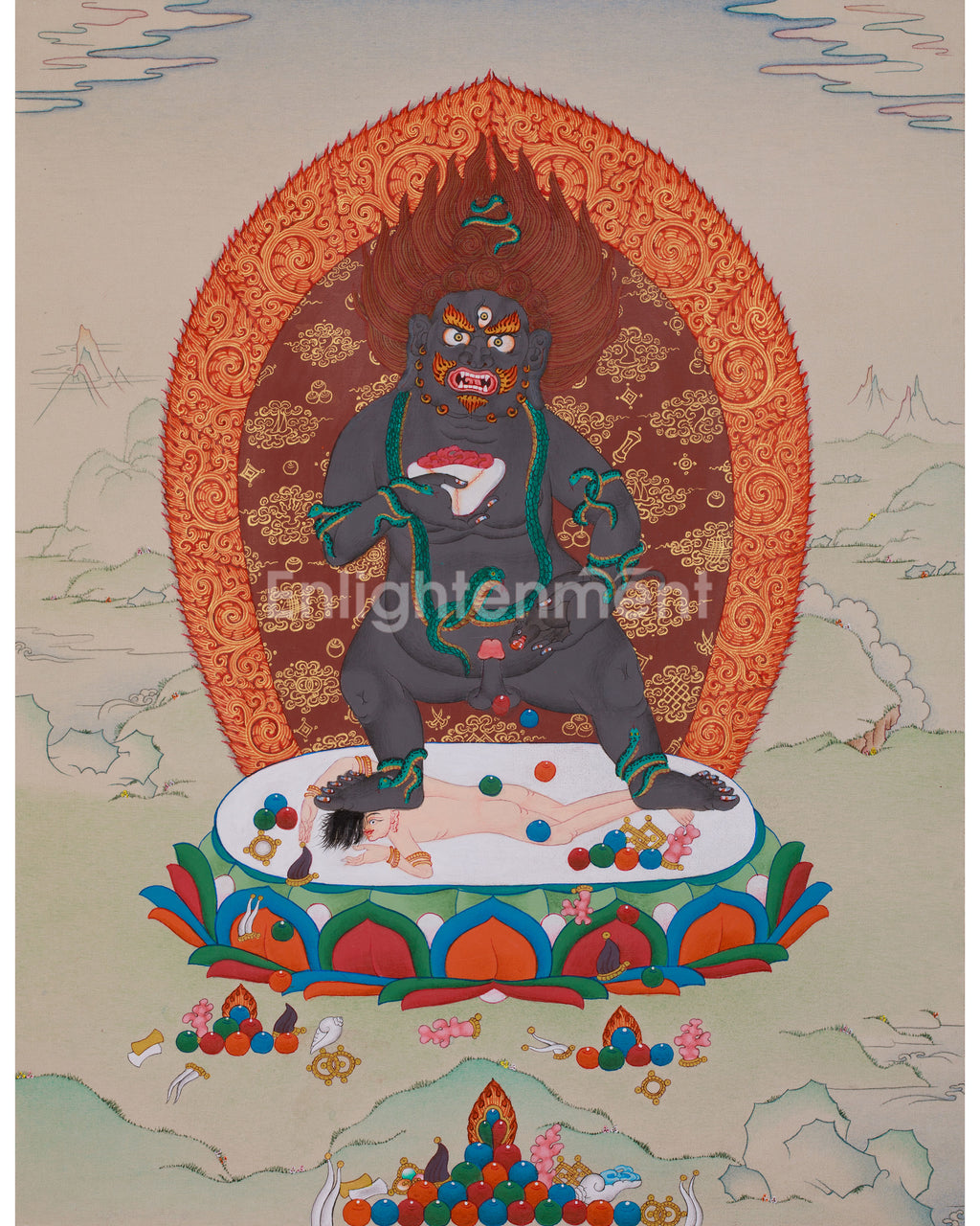 Black Dzambhala, a revered wealth deity in Tibetan Buddhism, is believed to grant material riches and remove obstacles to prosperity. Often depicted in a fierce and wrathful form, his image symbolizes his strength and authority over barriers. In this thangka, he stands above the figures on a lotus throne, surrounded by vibrant offerings that symbolize the wealth and abundance he bestows. His expression and posture convey his formidable energy, prepared to eliminate obstacles and protect his followers. This thangka serves as a powerful symbol of divine protection and prosperity. Displaying this thangka in your space can invoke Black Dzambhala's blessings, attracting wealth, success, and spiritual safety into your life.