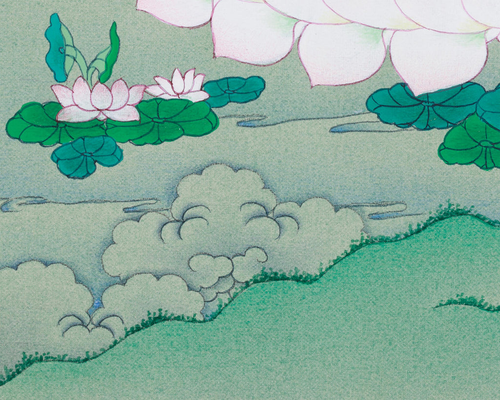 In Tibetan Buddhism, Chenrezig, also known as Avalokitesvara in Sanskrit, is a significant Bodhisattva of Compassion. He is honored as the protector who listens to the cries of all beings and vows never to stop until every soul is freed from suffering. In this thangka, Chenrezig is depicted with four arms, symbolizing his limitless compassion that extends in all directions. His upper hands hold a crystal rosary and a lotus, symbols of purity and ongoing compassion. His lower hands are in prayer, which stands for unity and devotion. Seated on a luminous lotus throne amidst a tranquil mountain scene, he radiates serenity and divine purity, inspiring practitioners to discover their own capacity for love and wisdom.