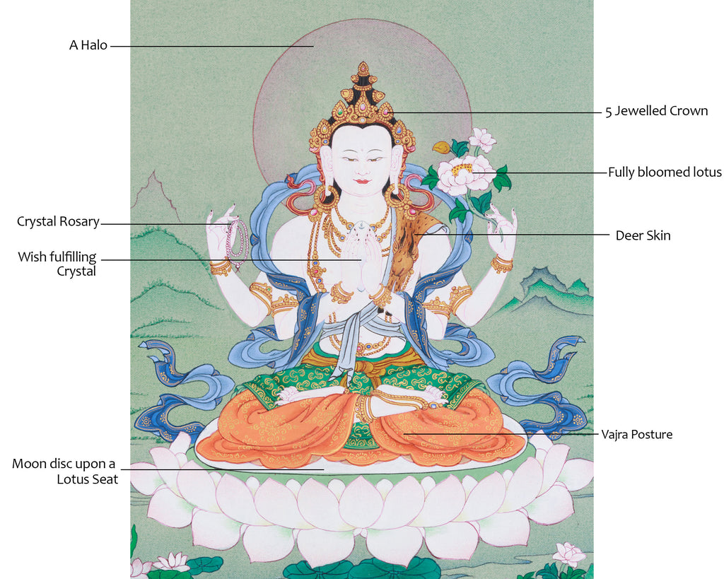 13 Inch Tibetan Bodhisattva Chenrezig Painting | Deity of Mercy, Healing & Spiritual Guidance