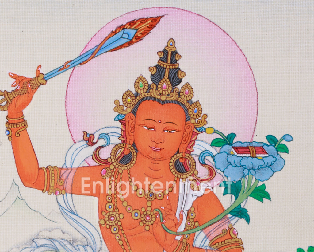 The Tibetan bodhisattva Manjushri thangka represents profound understanding that leads to enlightenment. His golden-orange body symbolizes wisdom—clarity, knowledge, and the eradication of ignorance. The five jewels on his crown signify the five wisdoms of an enlightened being. His hair is styled in a three-tiered topknot, which represents his deep understanding of meditation, imagination, and listening. It is created in the traditional Karma Gadri style on cotton canvas, using natural stone colors. The painting's brightness is enhanced by gold highlights that emphasize Manjushri's energy and wisdom.