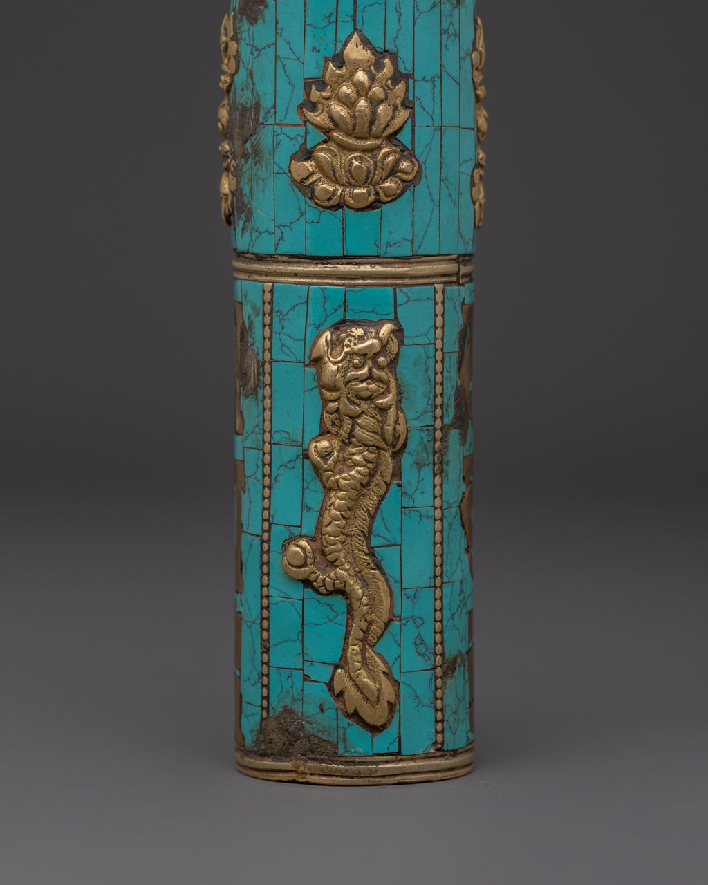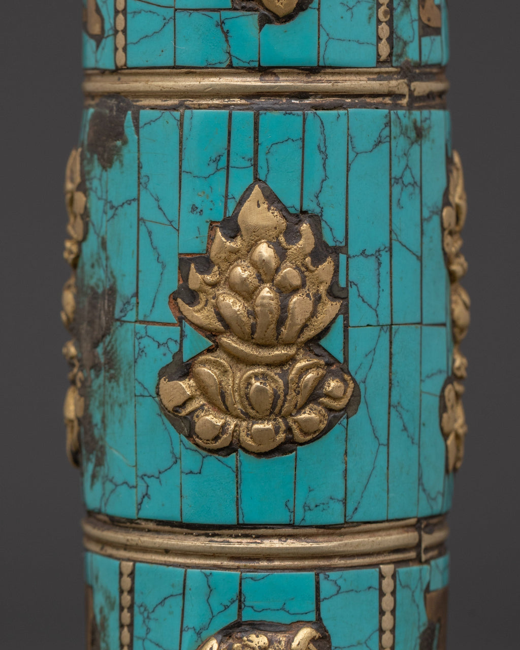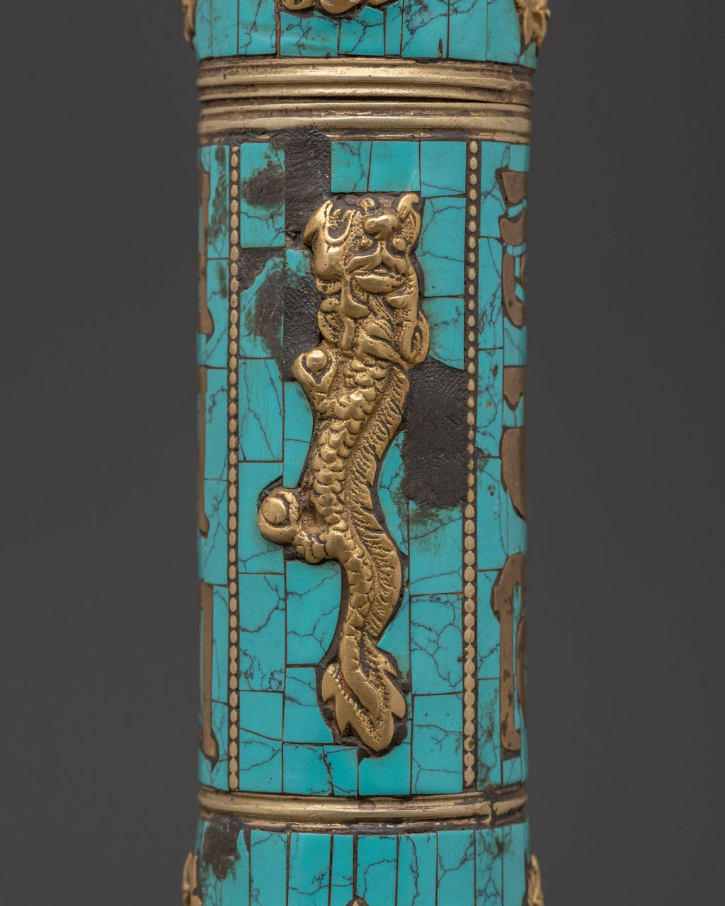 This Tibetan Brass Incense Burner is a beautiful embodiment of spiritual devotion and artistic craftsmanship. Measuring 28cm in height and 4cm in width, this handcrafted piece combines brass and copper with intricate inlays of lapis lazuli, coral, and turquoise. Traditionally used during Buddhist rituals, it is designed to hold incense sticks or powder, releasing fragrant smoke that purifies the environment and enhances meditation. The elegant detailing and vibrant stone accents make it an exquisite addition to your altar or sacred space.