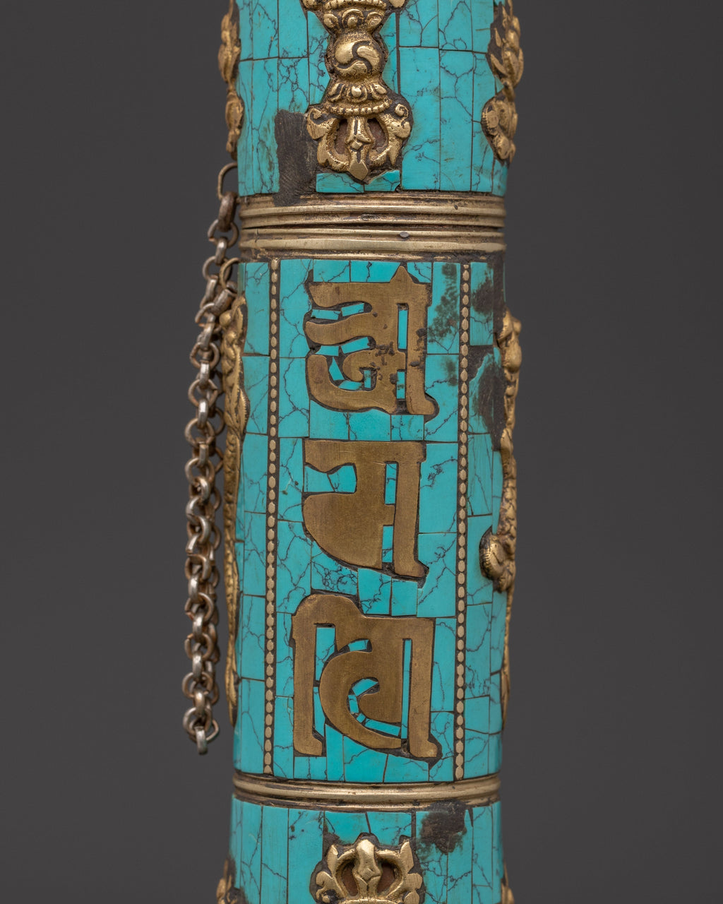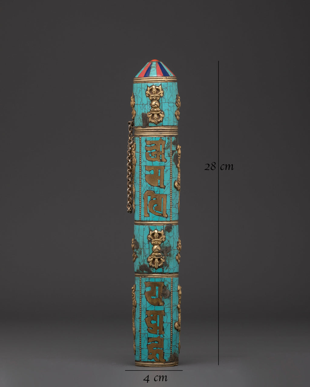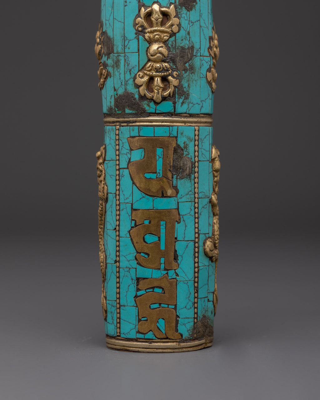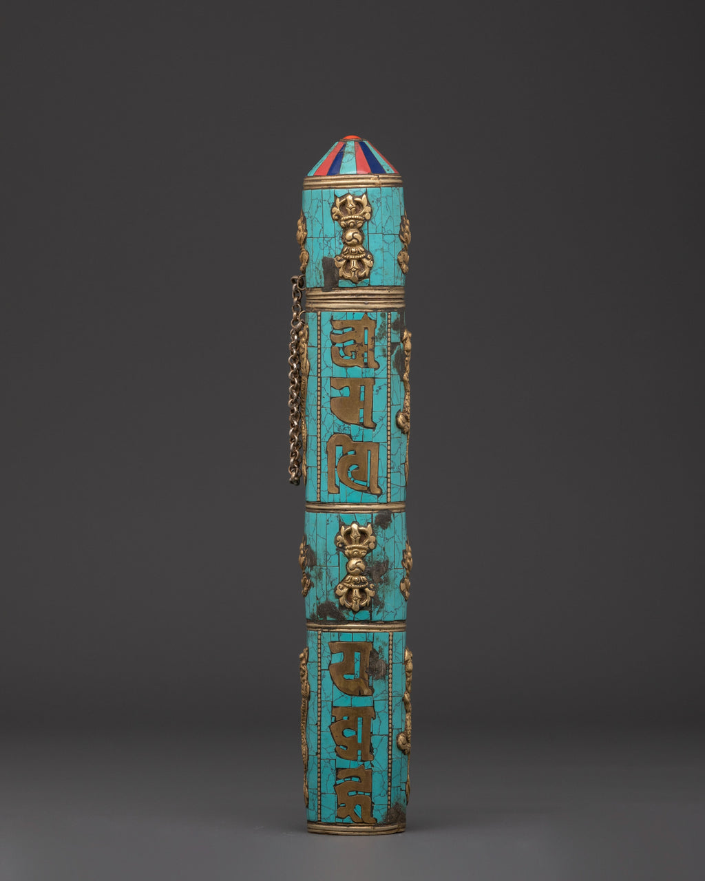 This Tibetan Brass Incense Burner is a beautiful embodiment of spiritual devotion and artistic craftsmanship. Measuring 28cm in height and 4cm in width, this handcrafted piece combines brass and copper with intricate inlays of lapis lazuli, coral, and turquoise. Traditionally used during Buddhist rituals, it is designed to hold incense sticks or powder, releasing fragrant smoke that purifies the environment and enhances meditation. The elegant detailing and vibrant stone accents make it an exquisite addition to your altar or sacred space.