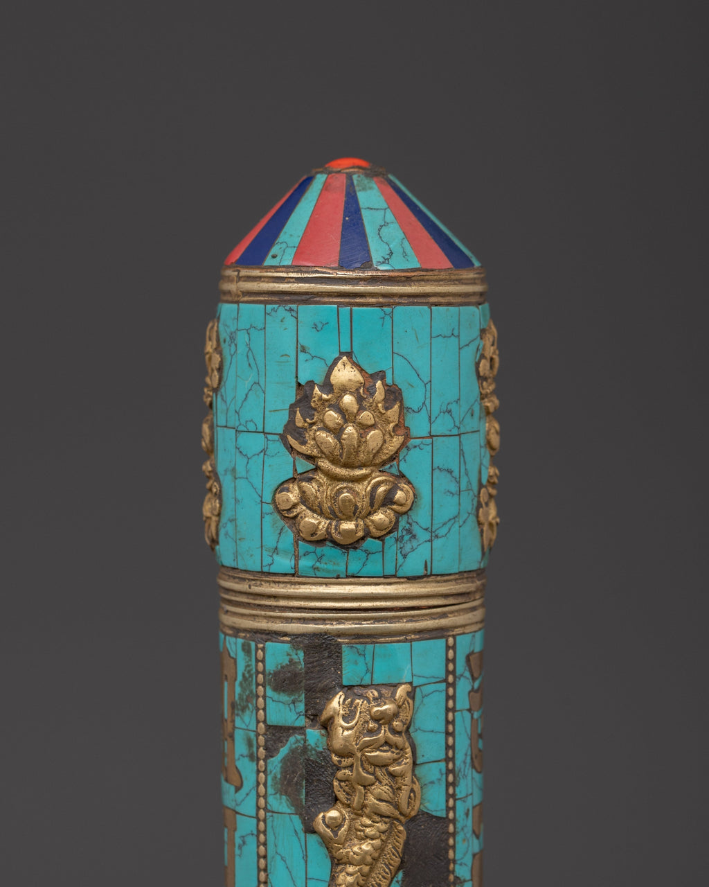Every detail of this incense burner reflects the skill and symbolism of Tibetan artisans who have passed down their techniques through generations. The brass body signifies strength and purity, while the copper and gemstone embellishments represent the harmony of body, mind, and spirit. The combination of turquoise, coral, and lapis stones is believed to balance energy, invite healing, and promote spiritual clarity. Its lightweight 0.25kg design makes it suitable for both temple use and personal meditation settings.